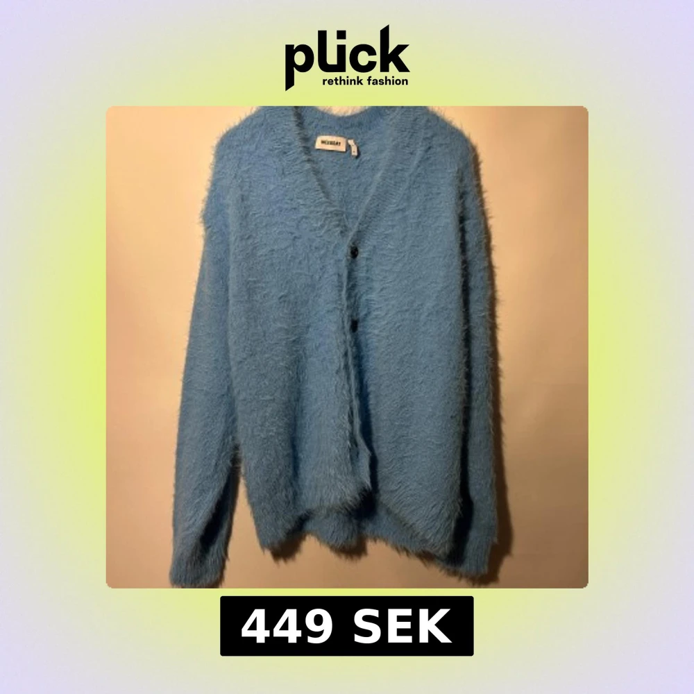 Ljusblå, fluffig kofta med V-ringning och knappar framtill. Koftan har en avslappnad passform och långa ärmar. Mycket bra skick, sparsamt använd