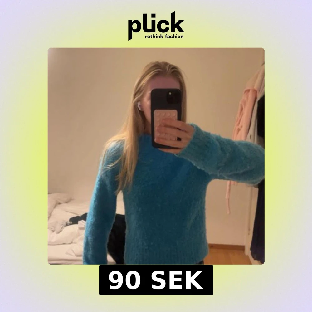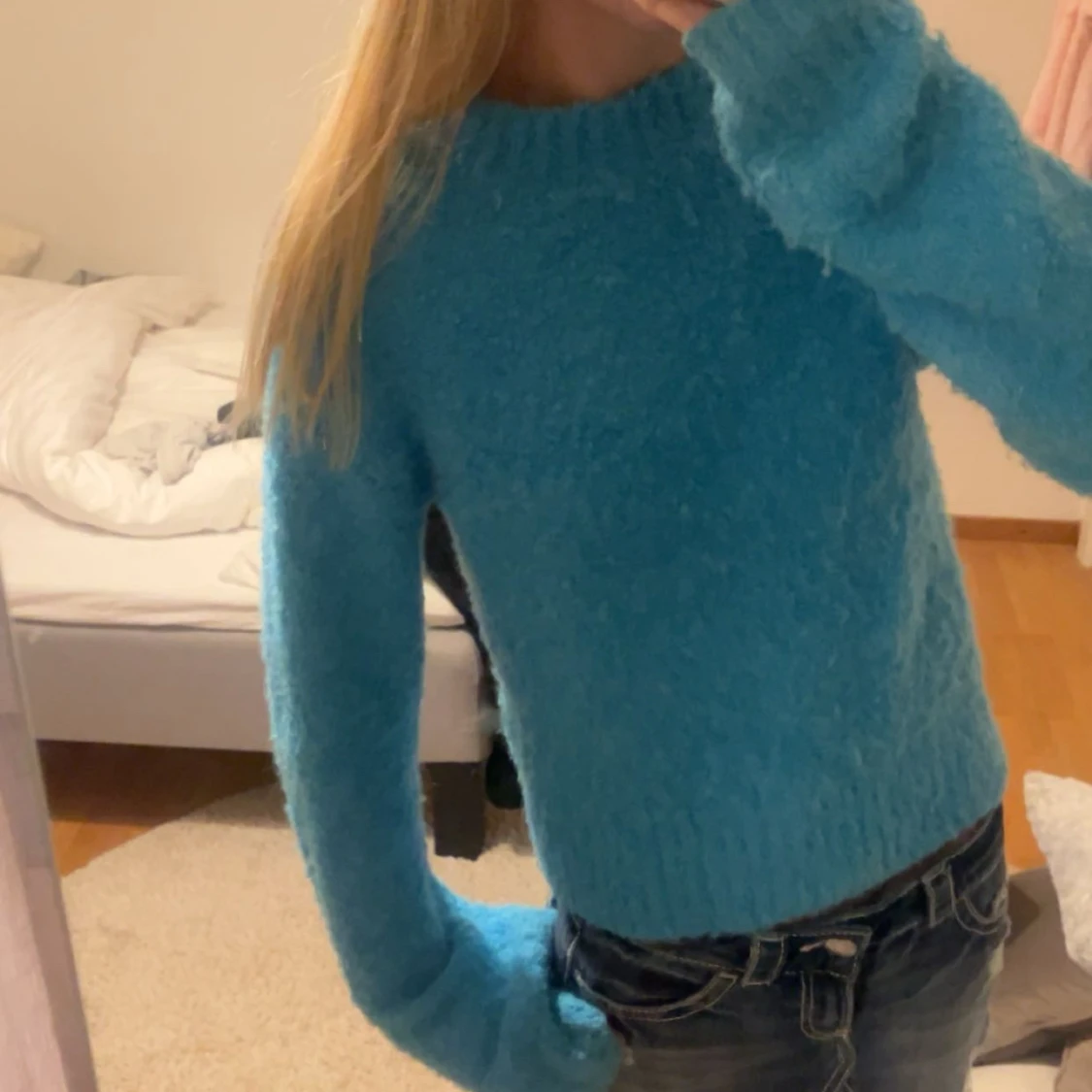 Supermysig blå stickad tröja med fluffig känsla och rund hals. Långärmad modell med relaxed fit, perfekt för kyliga dagar. Enkel och stilren design som är lätt att matcha med jeans eller kjol.