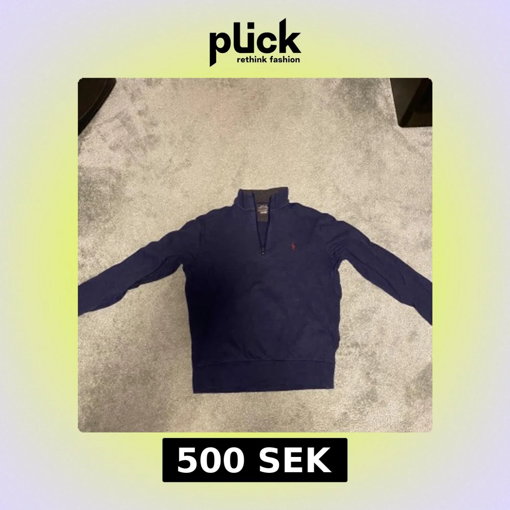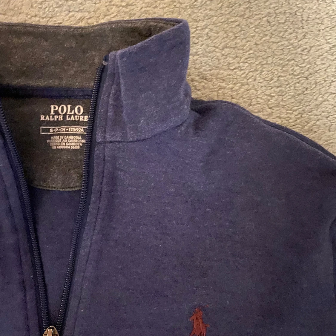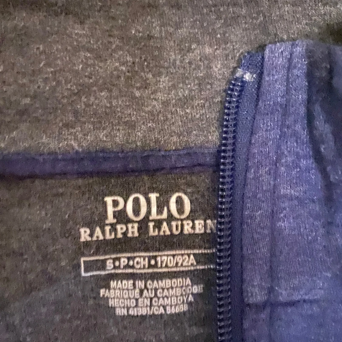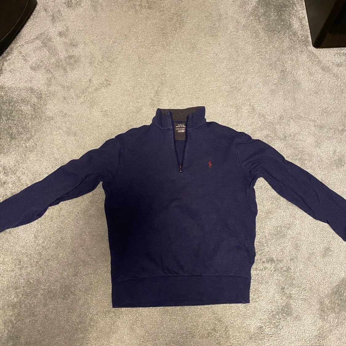 Säljer en blå långärmad tröja från Polo Ralph Lauren med halv dragkedja och hög krage. Tröjan har en liten broderad logga på bröstet och är perfekt för en stilren och avslappnad look.