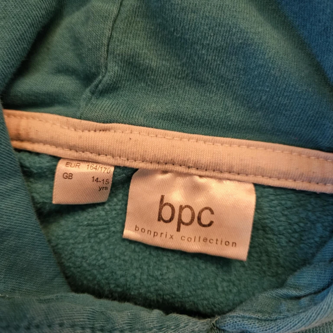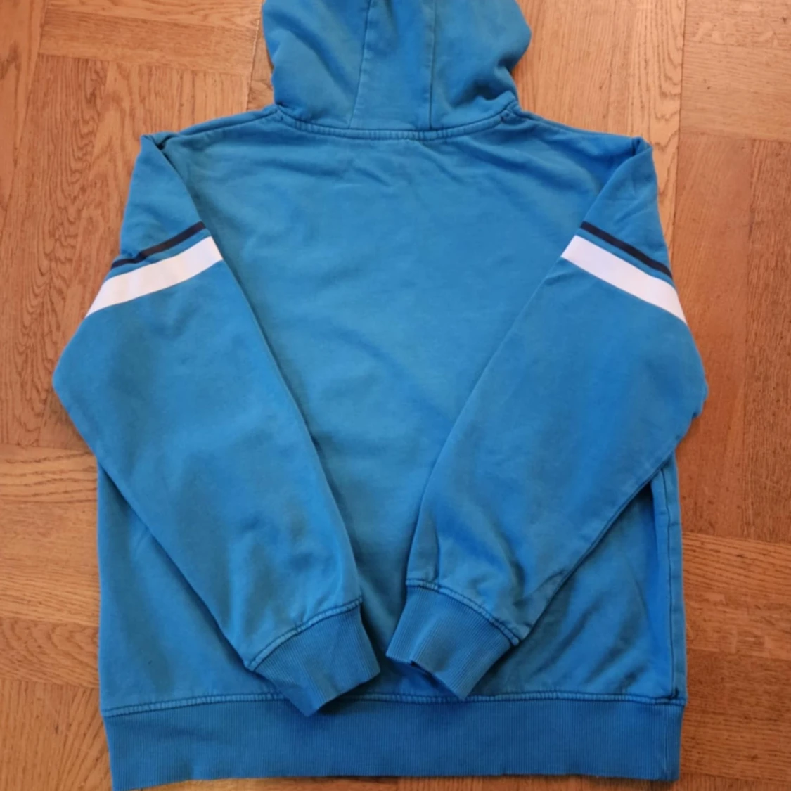 Säljer en blå hoodie från bpc med trycket 'NY 8' på framsidan. Tröjan har långa ärmar och en praktisk huva med snörning. Perfekt för en avslappnad stil.