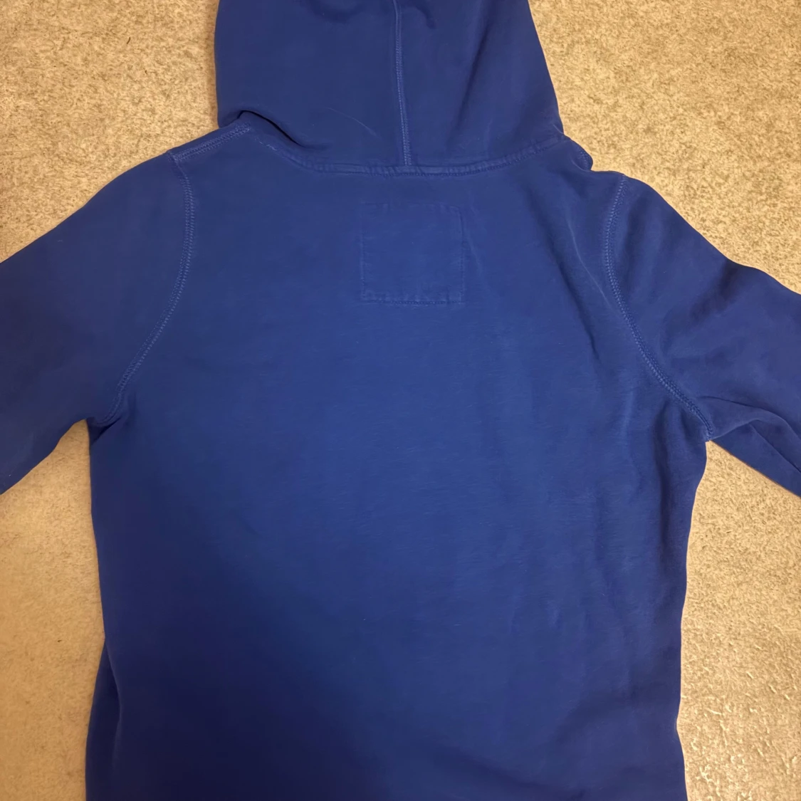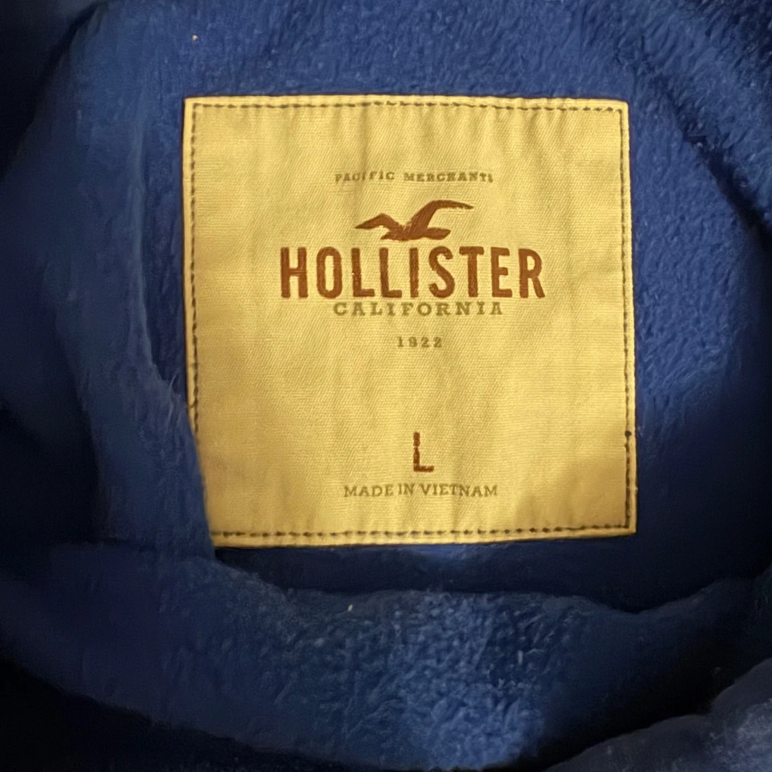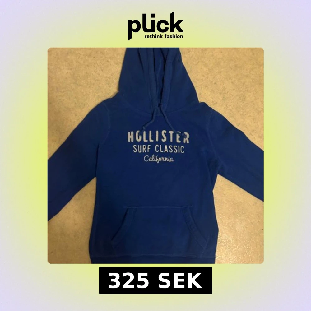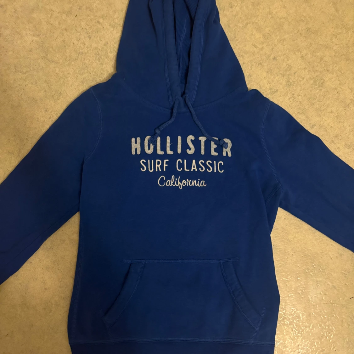 Snygg marinblå hoodie från Hollister med tryck 'Surf Classic California' på bröstet. Tröjan har huva med snörning, stor magficka och långa ärmar. Mjuk insida i fleece och klassisk passform, perfekt för chill dagar. Står storlek L passar storlek S inte några specifika defekter utan att den är använd. Varan är inte urtvättad.