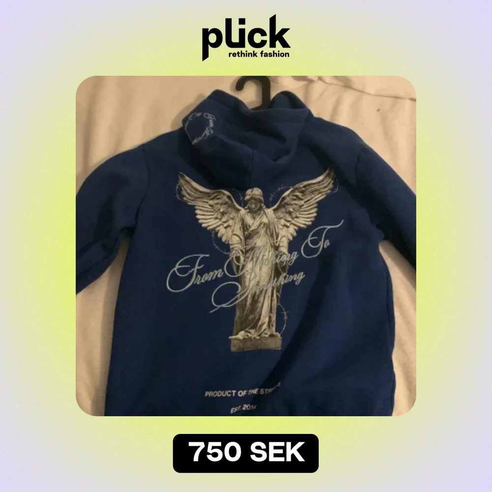 Säljer en snygg blå hoodie från Hoodrich med ett coolt tryck av en ängel och texten 'From Nothing To Something' på ryggen. Framtill finns också ett mindre tryck med samma tema. Hoodien är perfekt för både chill och streetwear-stil. Den har en klassisk passform med långa ärmar och en skön huva.