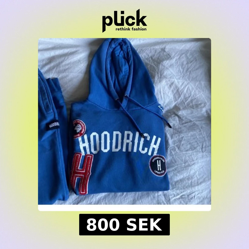 Säljer en blå hoodie från Hoodrich med stor vit logga på framsidan och flera detaljer som broderade märken. Hoodien har en klassisk känguruficka och justerbar huva med dragsko. Perfekt för en avslappnad stil.