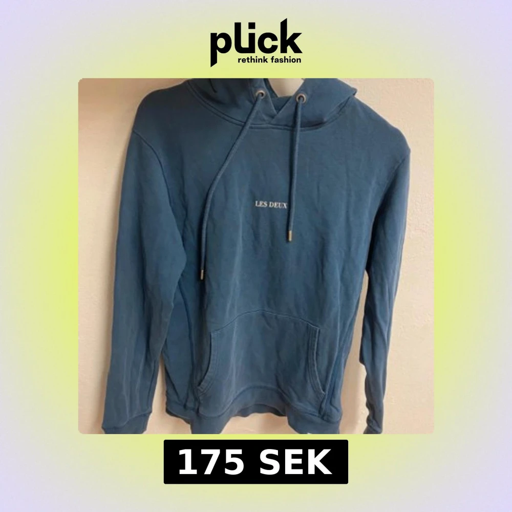 Säljer en blå hoodie från Les Deux med broderad logga på bröstet. Tröjan har huva med snörning, känguruficka och ribbade muddar. Perfekt för dig som gillar en clean och stilren look. Se bilder för egen bedömning