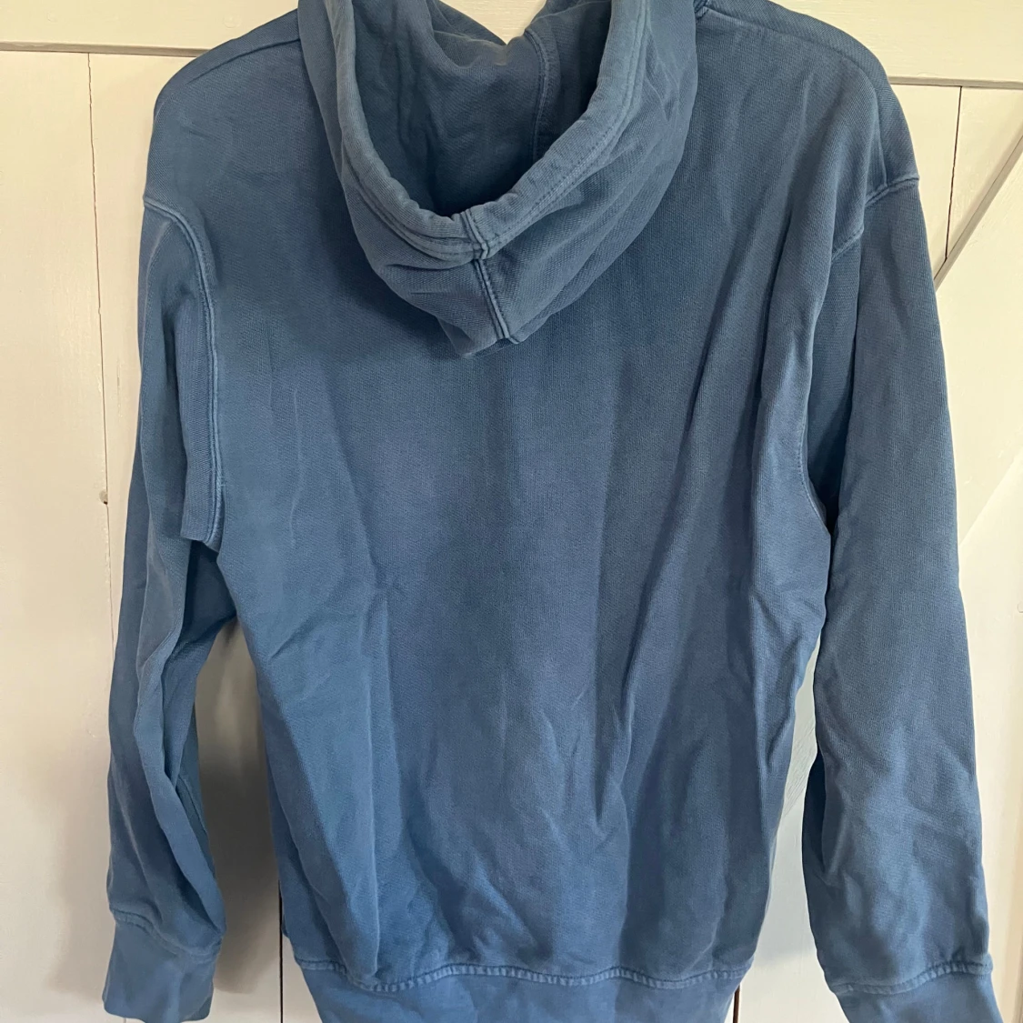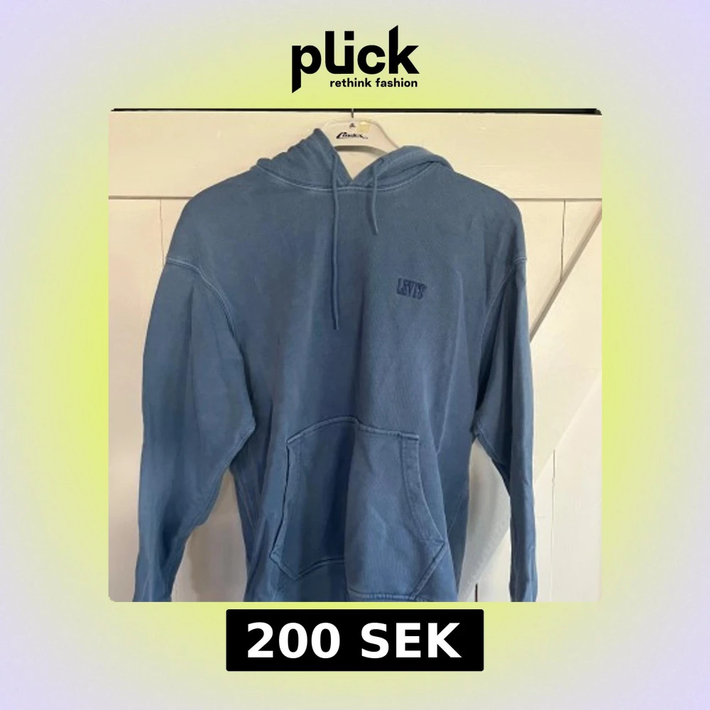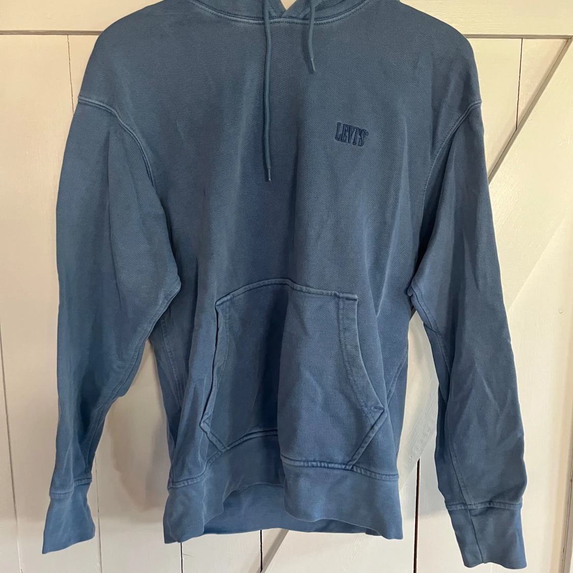 Säljer en blå hoodie från Levi's med broderad logga på bröstet. Tröjan har huva med snörning och en stor känguruficka framtill. Perfekt för dig som gillar en avslappnad och stilren look. Långärmad och i mjuk bomull.