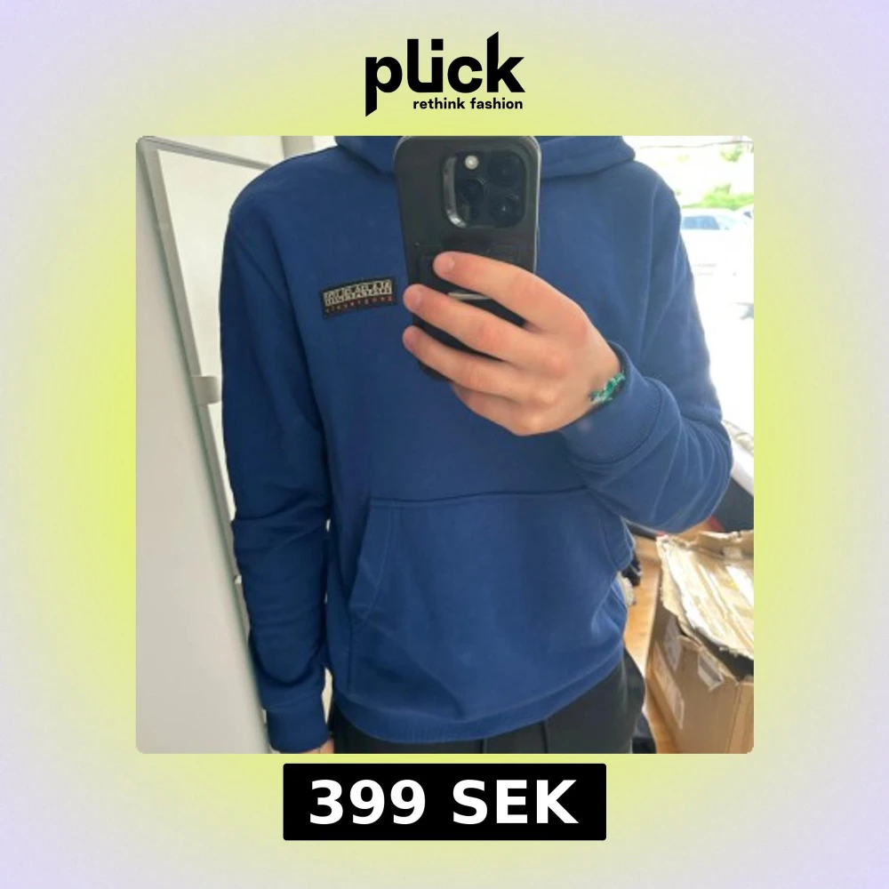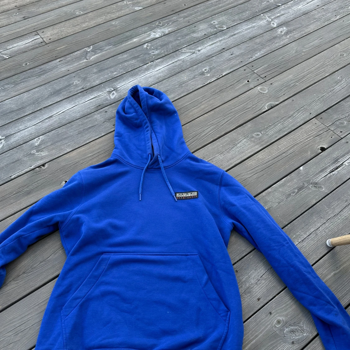 Säljer en blå hoodie från Napapijri med klassisk logga på bröstet. Tröjan har huva med snörning, stor magficka och långa ärmar. Perfekt för chill dagar och enkel att matcha med jeans eller joggers. Skön och mjuk bomullskvalitet. Jag är 181cm och 75kg