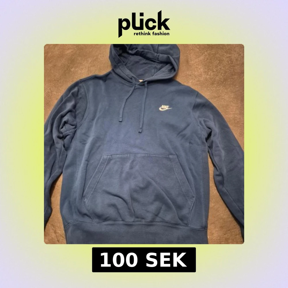 Säljer en blå hoodie från Nike med klassisk logga på bröstet. Tröjan har huva med snörning och en stor magficka framtill.