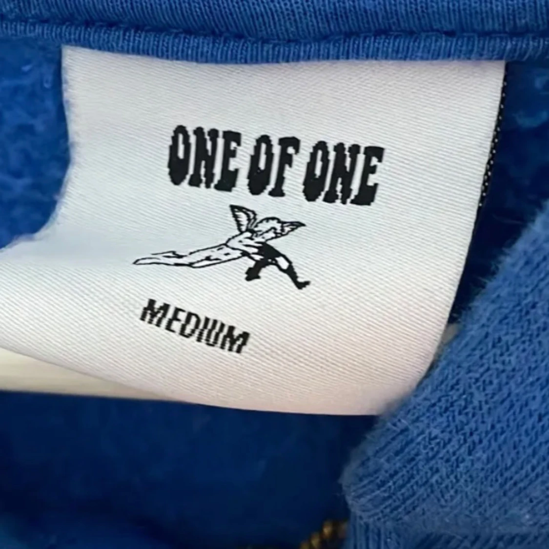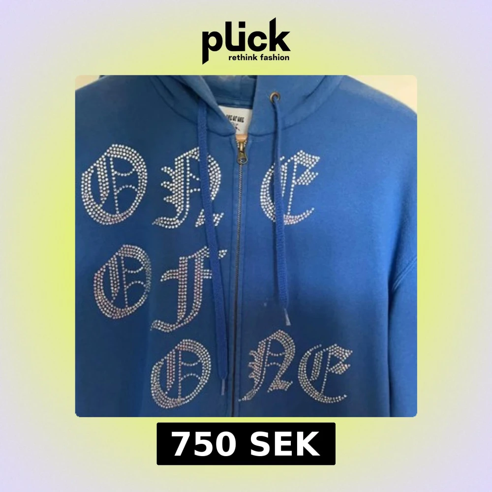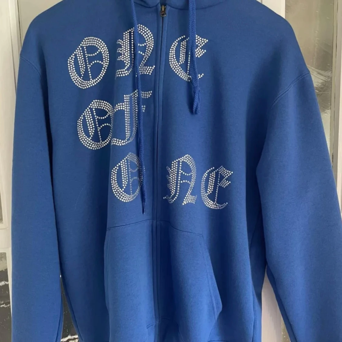 Snygg blå hoodie från One of One med dragkedja och text i glittriga stenar på framsidan. Perfekt för en cool och avslappnad stil. Den har en klassisk känguruficka och justerbar huva med dragsko.