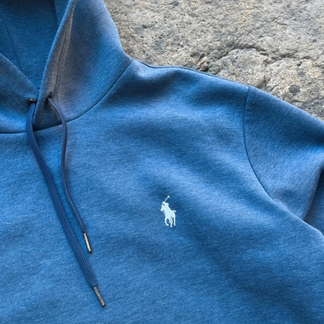 Snygg blå hoodie från Polo Ralph Lauren med klassisk logga broderad på bröstet. Tröjan har huva med snörning, känguruficka och ribbade muddar. Materialet är en mjuk blandning av bomull och polyester, perfekt för chill dagar.
