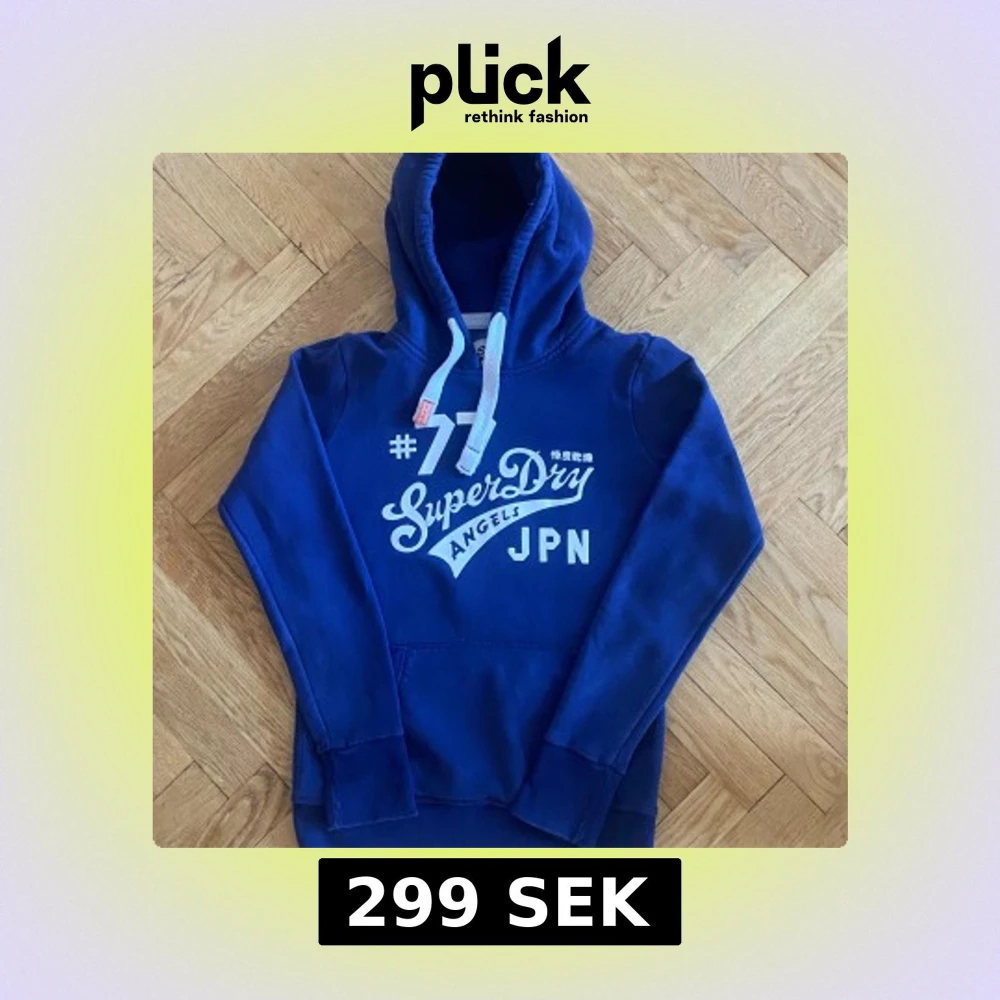 Säljer en snygg blå hoodie från SuperDry med vit text på framsidan. Den har en klassisk känguruficka och justerbar huva med vita snören. Perfekt för en avslappnad stil. Storlek M men passar S
