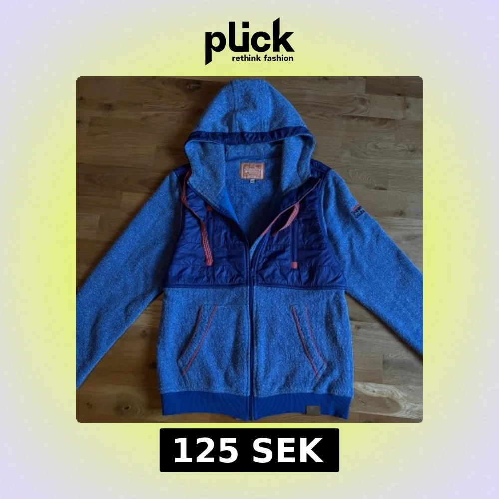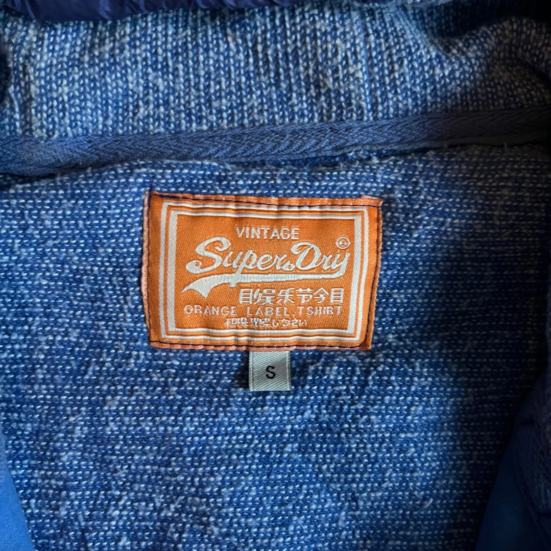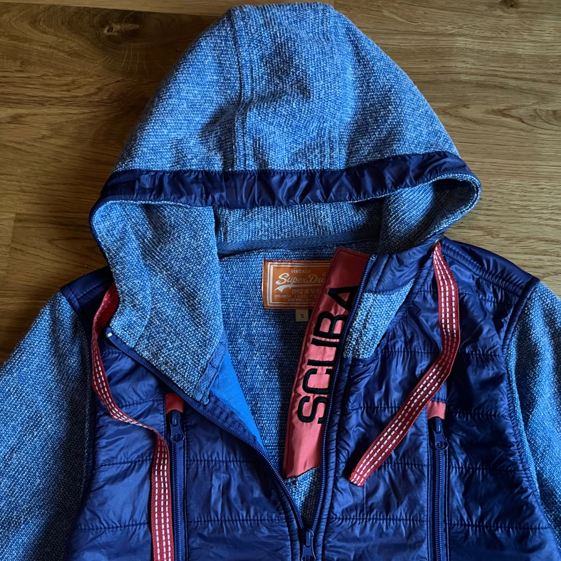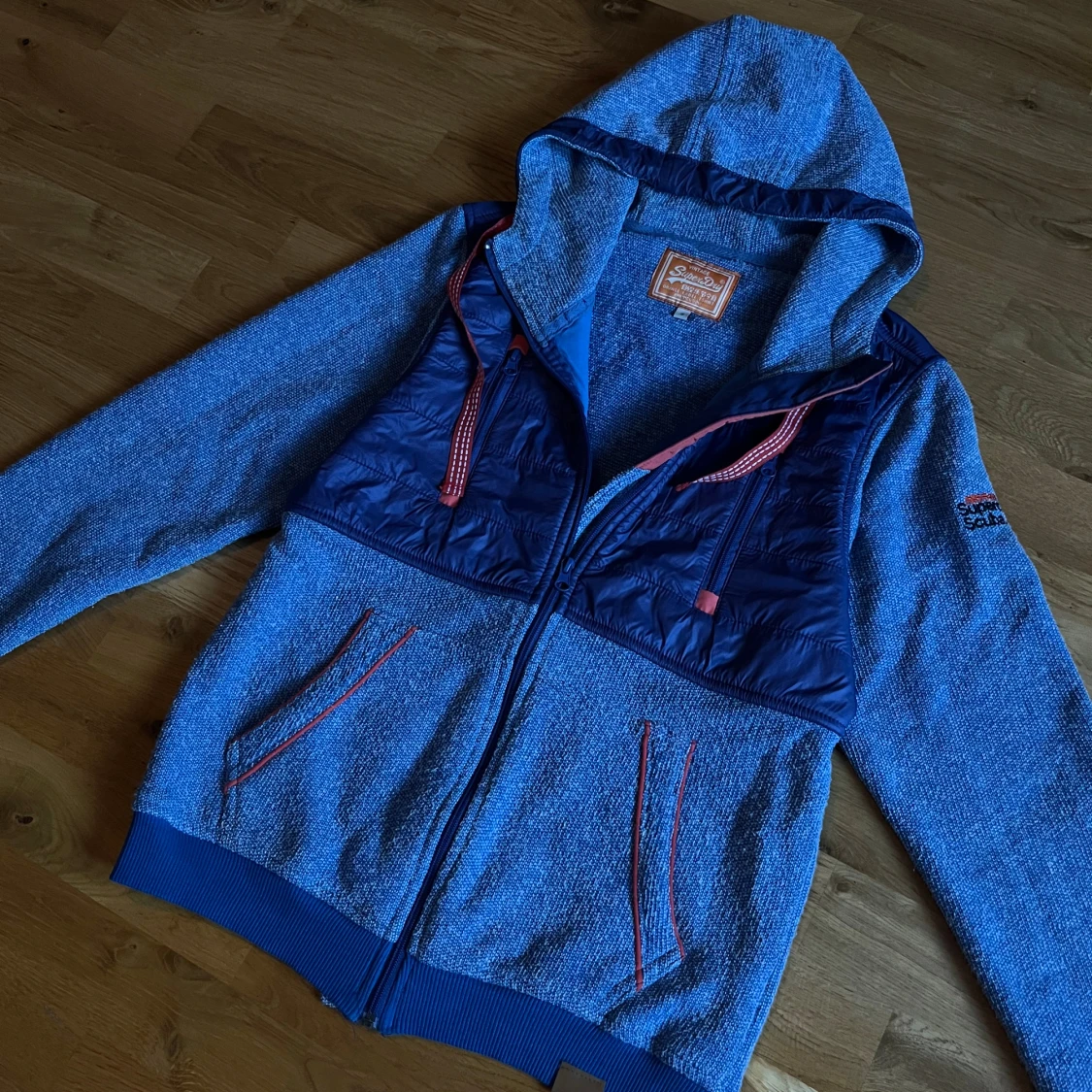 Säljer en blå hoodie från Superdry med coola detaljer. Tröjan har quiltad, mörkblå panel framtill, röda snören och dragkedja. Melerad blå bas, två fickor och broderad logga på ärmen. Perfekt för dig som gillar sportig och avslappnad stil.
