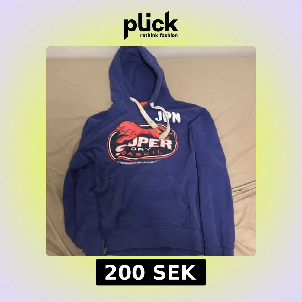Säljer en blå hoodie från Superdry med tryck på framsidan. Den har en justerbar huva med vita snören och en stor ficka framtill. Perfekt för en avslappnad stil.