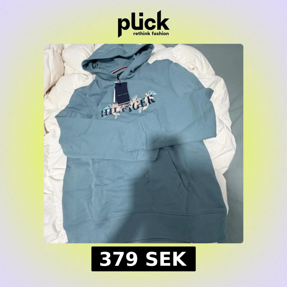 Snygg ljusblå hoodie från Tommy Hilfiger med broderad logga och bladmönster på bröstet. Tröjan har huva, magficka och långa ärmar. Perfekt för dig som vill ha en chill och stilren look med en touch av färg.