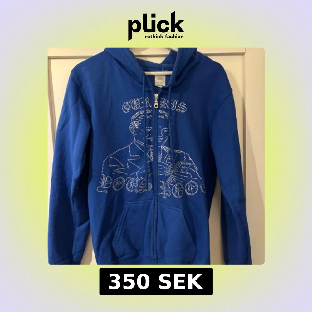 Säljer en blå hoodie med huva och dragkedja framtill. Framsidan har ett coolt motiv i rainstones med text och en figur. Tröjan har känguruficka och långa ärmar. Perfekt för dig som gillar streetstyle och vill sticka ut lite extra.