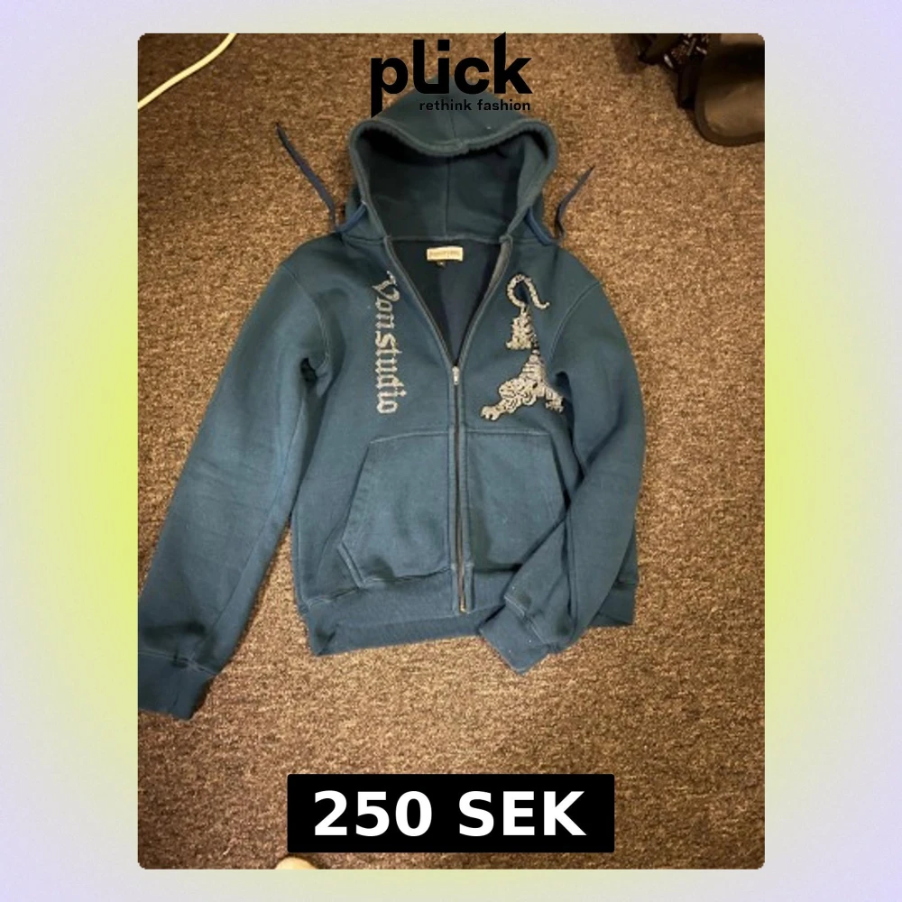 Snygg mörkblå hoodie från Vonstudio med huva och dragkedja framtill. På bröstet finns ett coolt tigertryck i silver och texten 'Vonstudio' i glittriga bokstäver. Tröjan har långa ärmar och två fickor framtill.