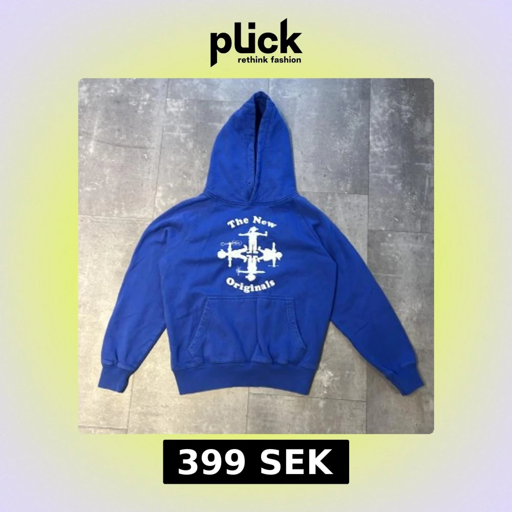 Blå hoodie med vitt unikt tryck, storlek S. Sitter bra för mig som är 180 ish