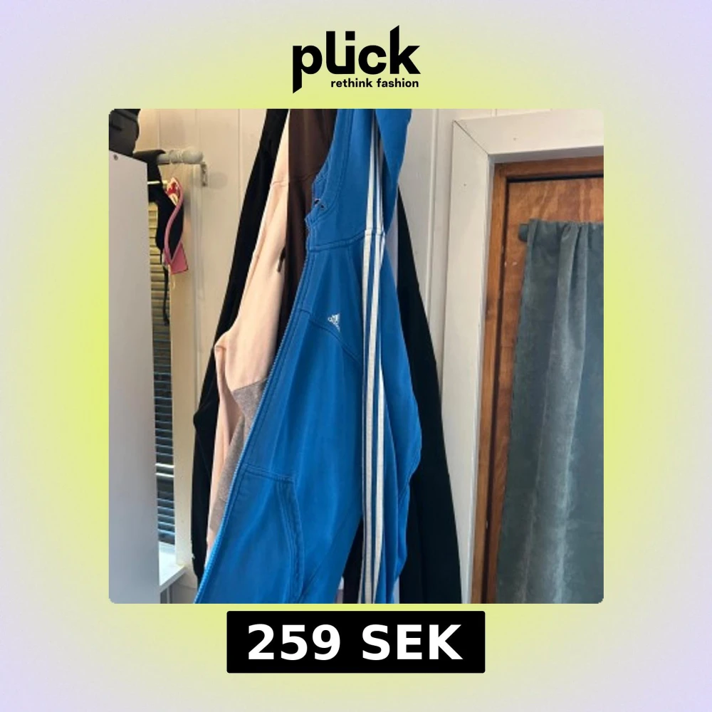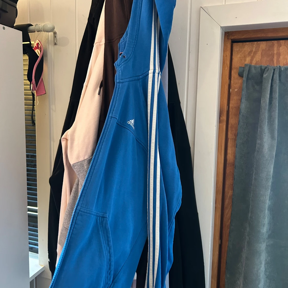 Säljer en blå huvtröja från Adidas med dragkedja och vita ränder längs ärmarna. Perfekt för en sportig look eller avslappnad stil. Tröjan har en klassisk design med Adidas-logga på bröstet.
