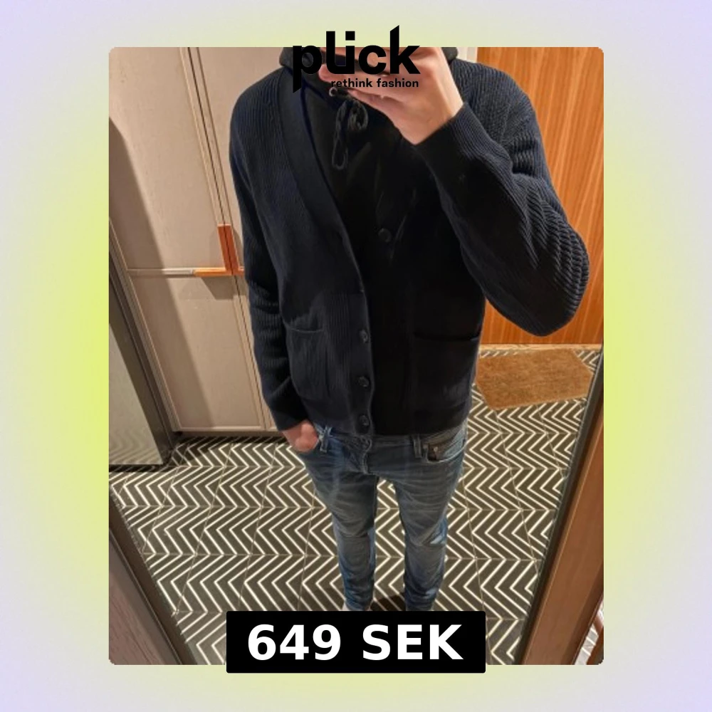 Snygg mörkblå stickad kofta med ribbad struktur och djup v-ringning. Koftan har fem knappar framtill och två praktiska fickor. Perfekt att slänga över en hoodie för en chill och stilren look. Passar dig som gillar klassisk stil med en modern twist.