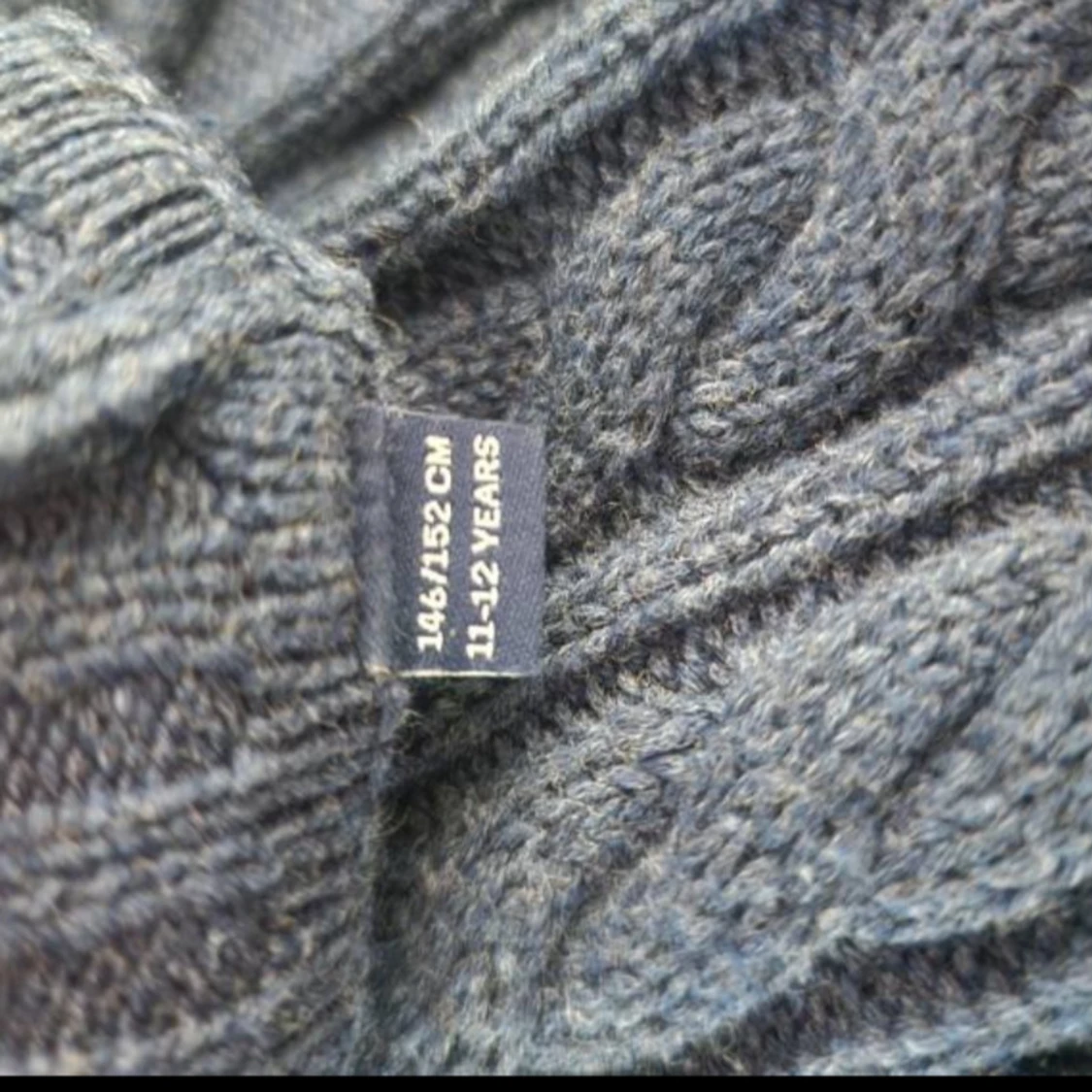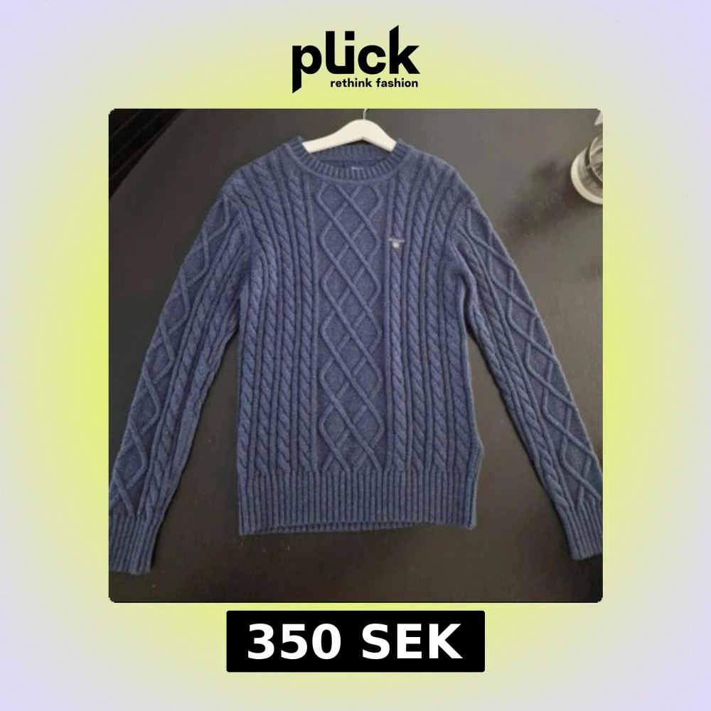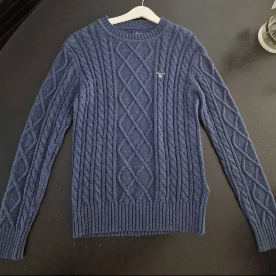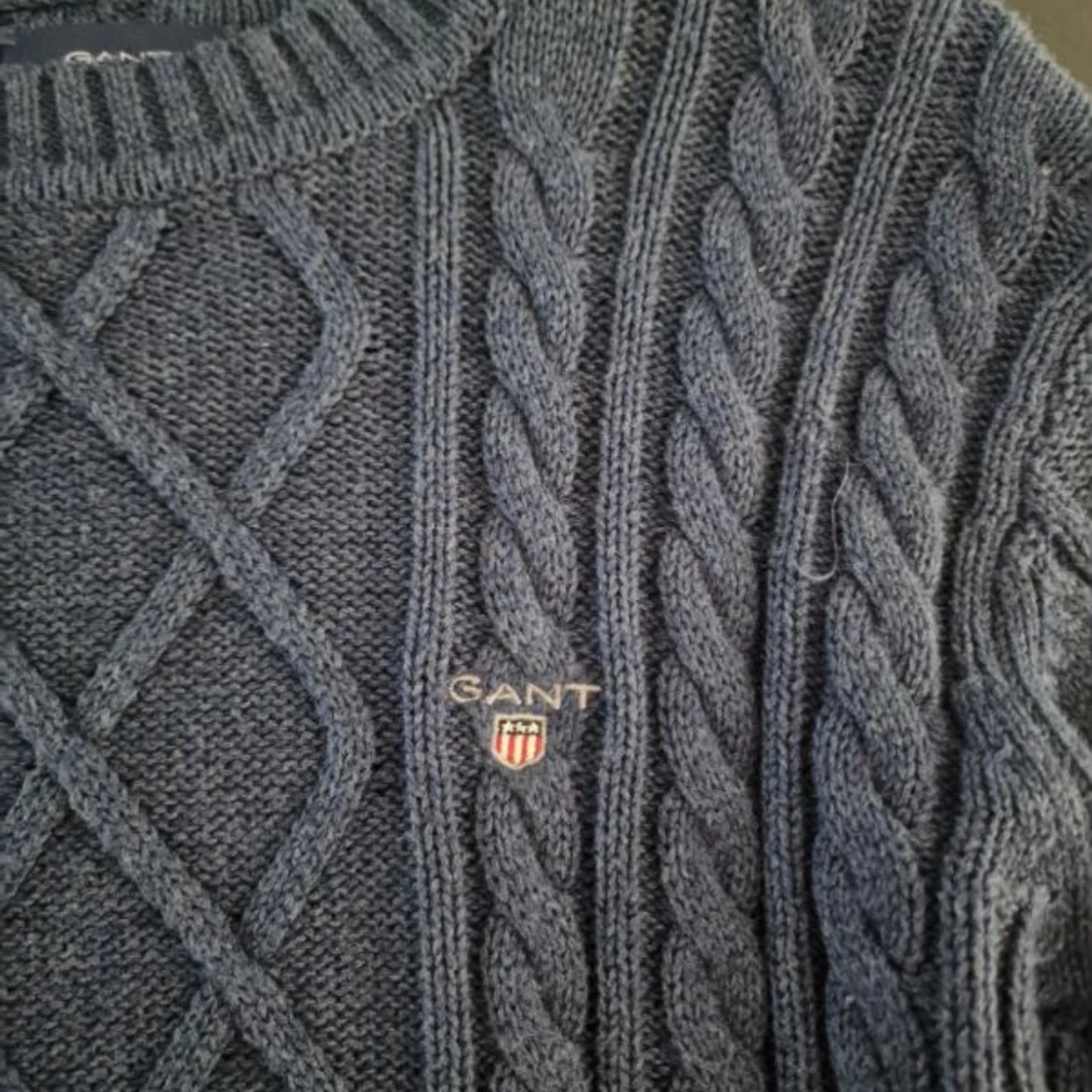 Kabelstickad blå tröja från Gant med broderad logga på bröstet. Tröjan har ett klassiskt flätmönster och ribbade muddar vid ärmslut. Tröjan har inte använts jätte mycket och finns inga tecken på användning.
