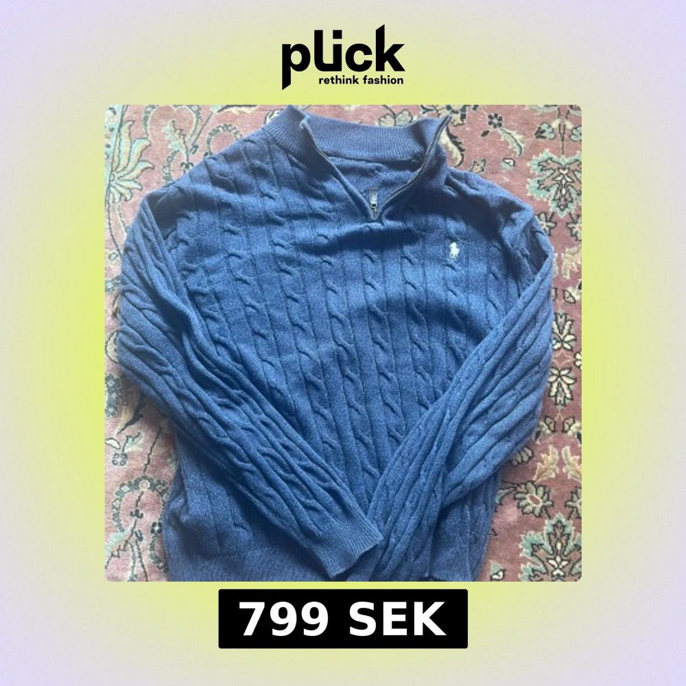 Säljer en marinblå kabelstickad tröja från Polo Ralph Lauren med halv dragkedja.