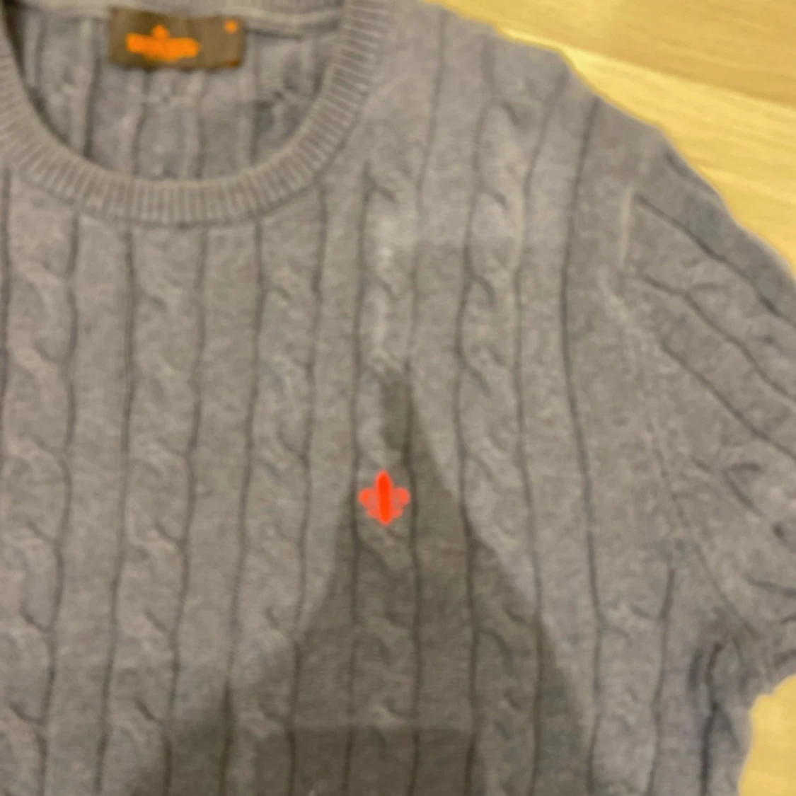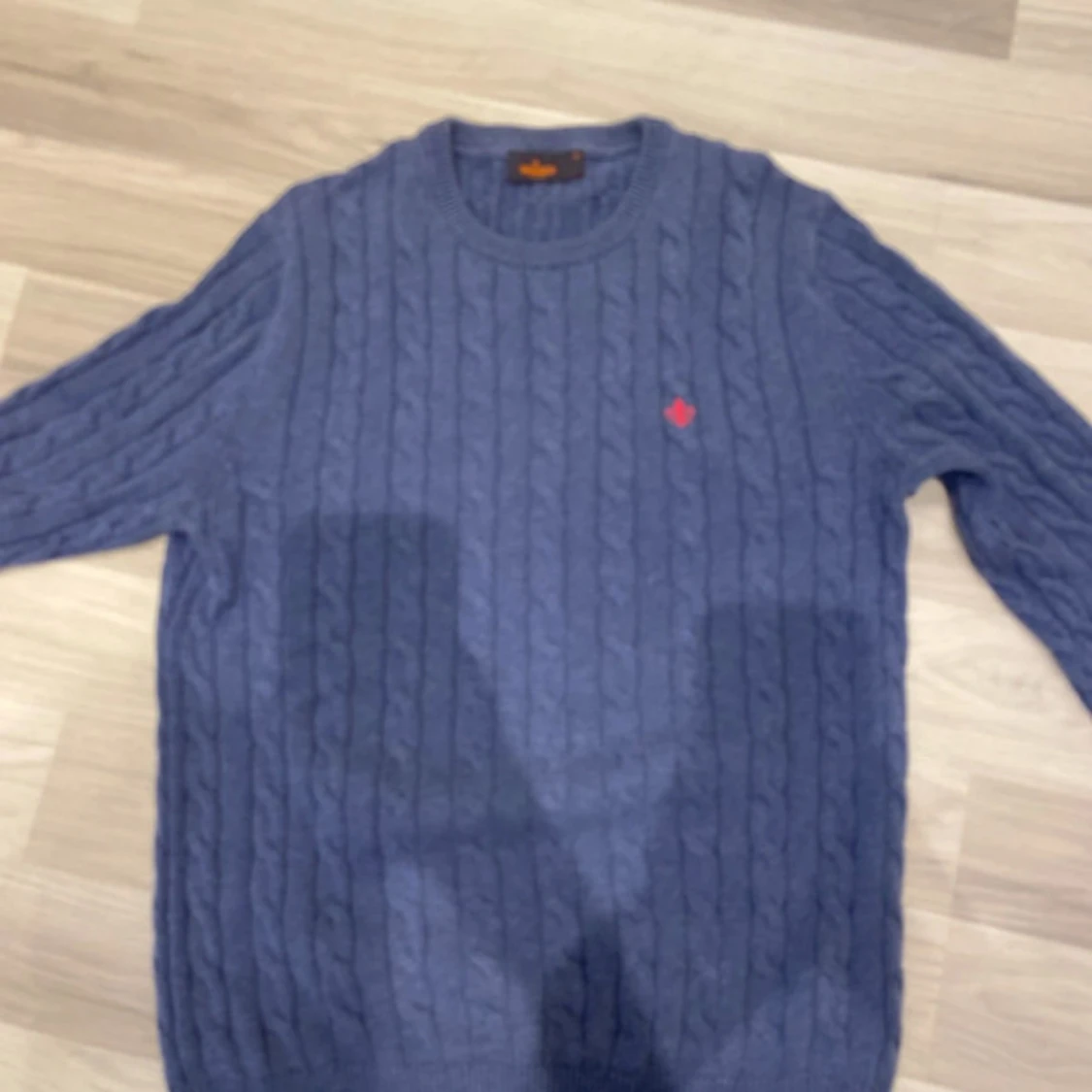 Kabelstickad blå tröja från Morris med rund hals och ett rött broderat emblem på bröstet. Tröjan har lång ärm och ribbade muddar vid ärmslut och nederkant. Perfekt för dig som gillar klassisk och stilren look.