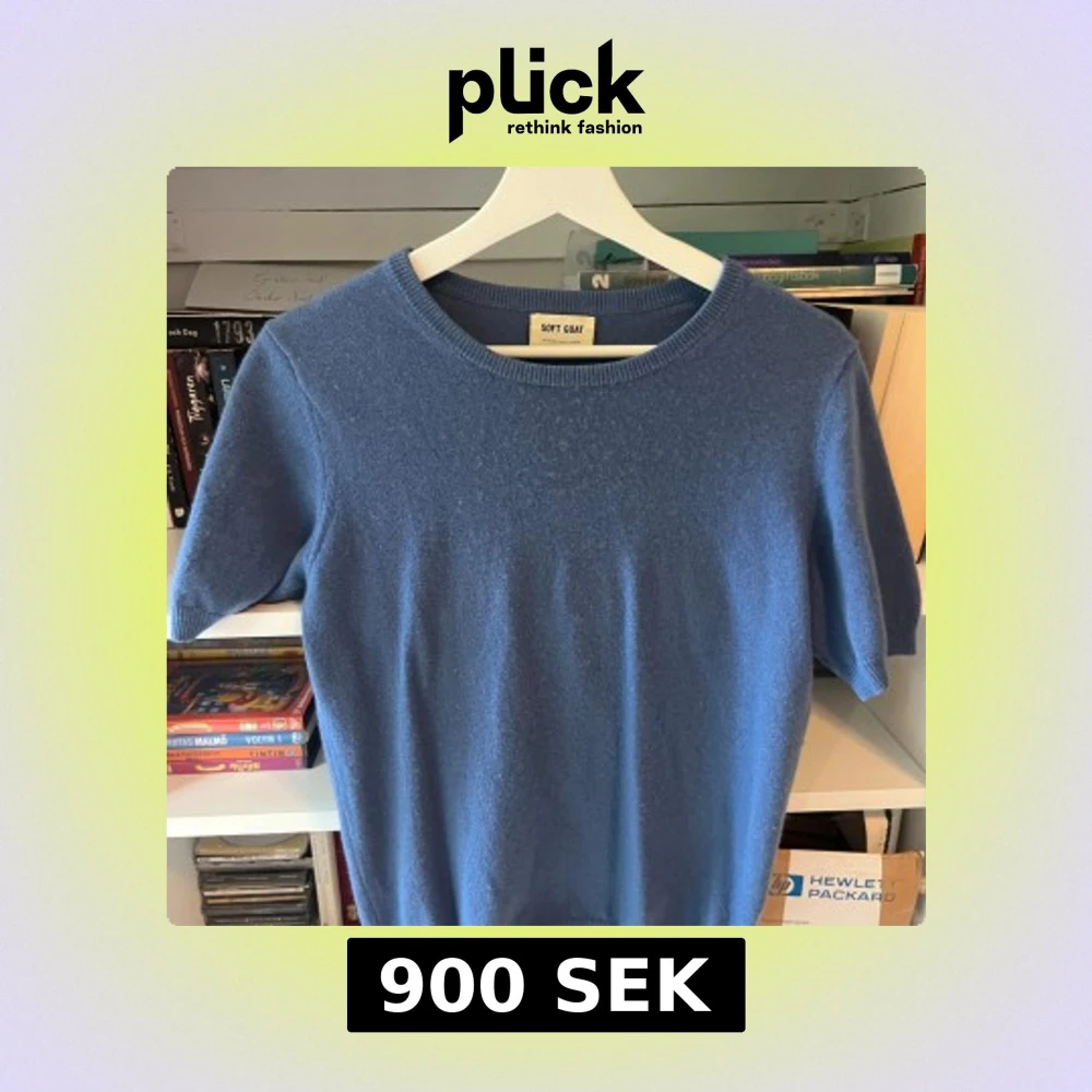 Superskön blå tröja från Soft Goat i 100% kashmir. Modellen har korta ärmar, rund halsringning och ribbade muddar. Perfekt för dig som vill ha en mjuk och stilren tröja med lyxig känsla. Passar lika bra till jeans som till kjol.