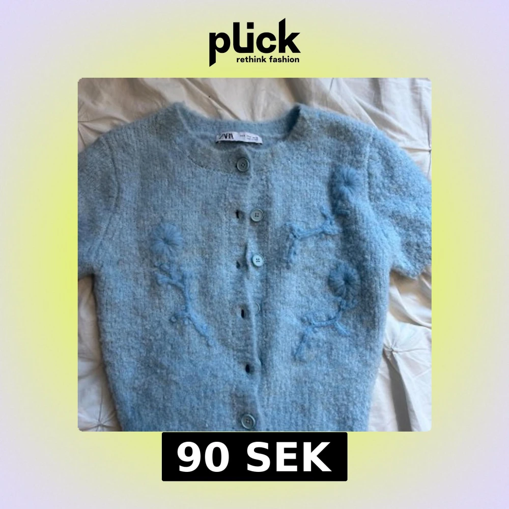 Superfin ljusblå kofta från Zara med kort ärm och broderade blommor framtill. Koftan är stickad i mjukt material och har knappar hela vägen. Perfekt för lager-på-lager och ger en söt touch till din outfit.