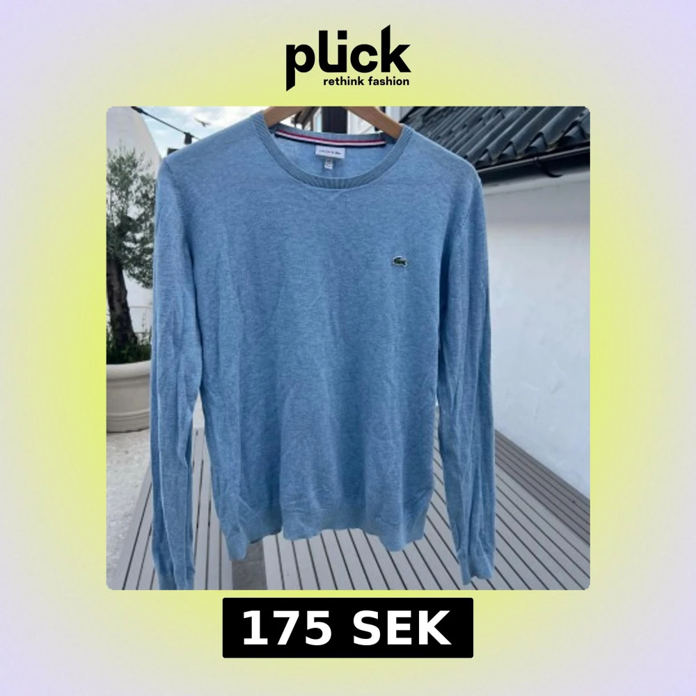 Säljer en ljusblå stickad tröja från Lacoste med klassisk rund halsringning och den ikoniska krokodilloggan broderad på bröstet. Tröjan har långa ärmar och ribbade muddar för en snygg passform. Perfekt för dig som gillar stilren och enkel design.