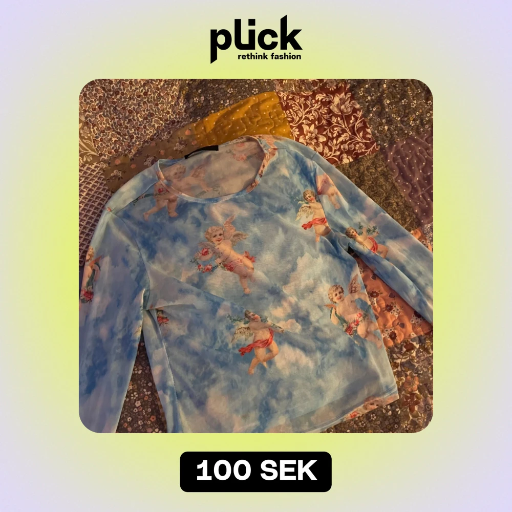 Säljer en superfin blå långärmad topp från Shein med ett unikt änglamotiv. Perfekt för dig som vill ha något annorlunda i garderoben! Toppen är i ett lätt och bekvämt material, perfekt för vår och sommar. Genomskinligt mesh matrial