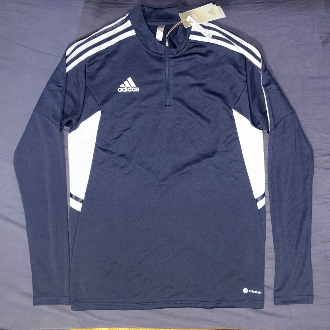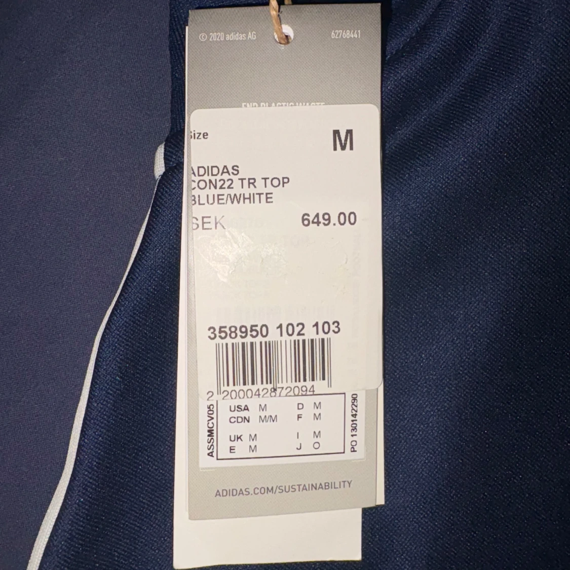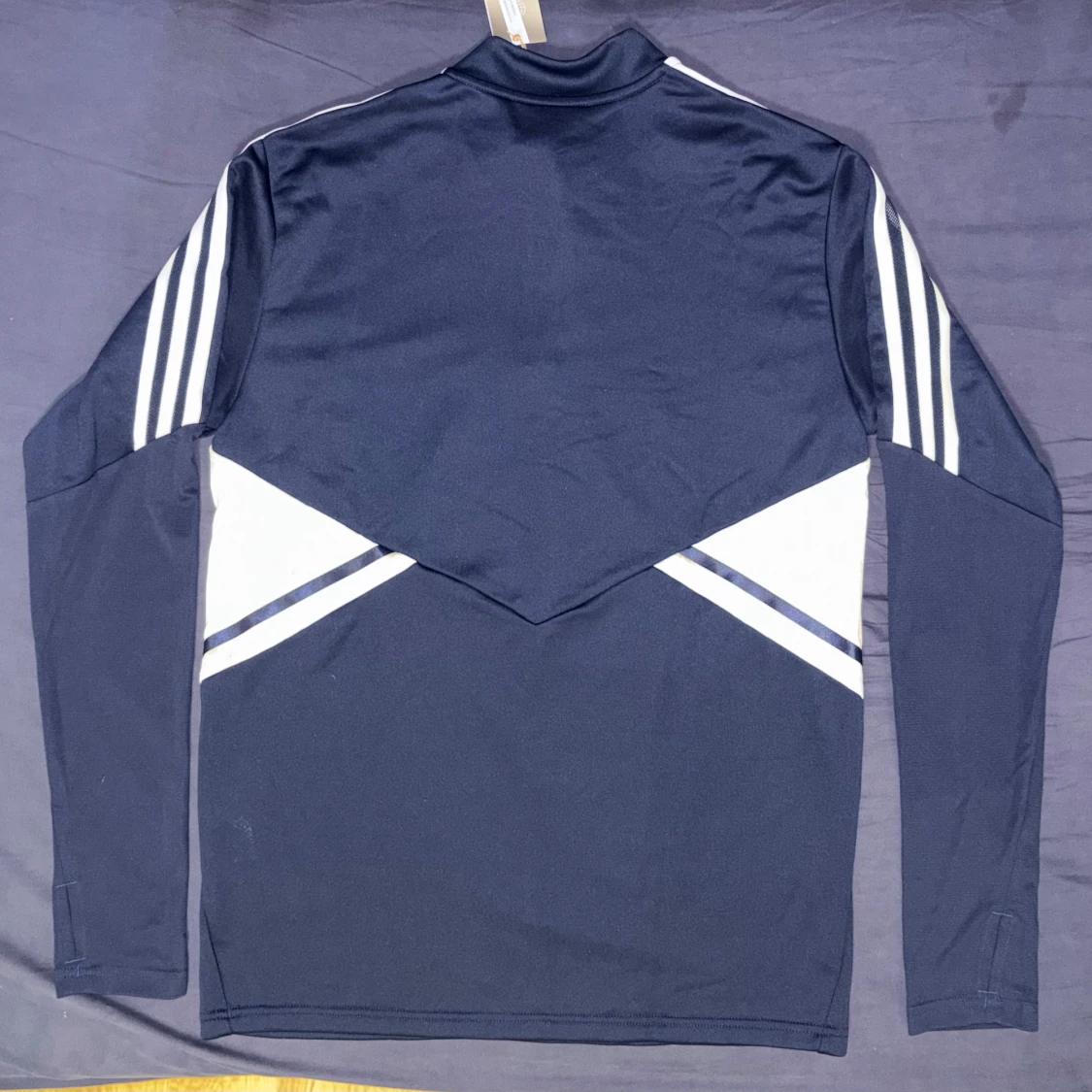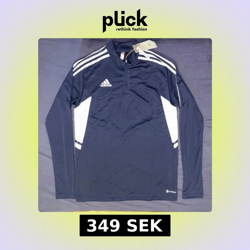 Säljer en blå långärmad träningströja från Adidas med vita detaljer och dragkedja vid halsen. Tröjan har klassiska Adidas-ränder på axlarna och är tillverkad i ett syntetmaterial som passar perfekt för sport och träning.