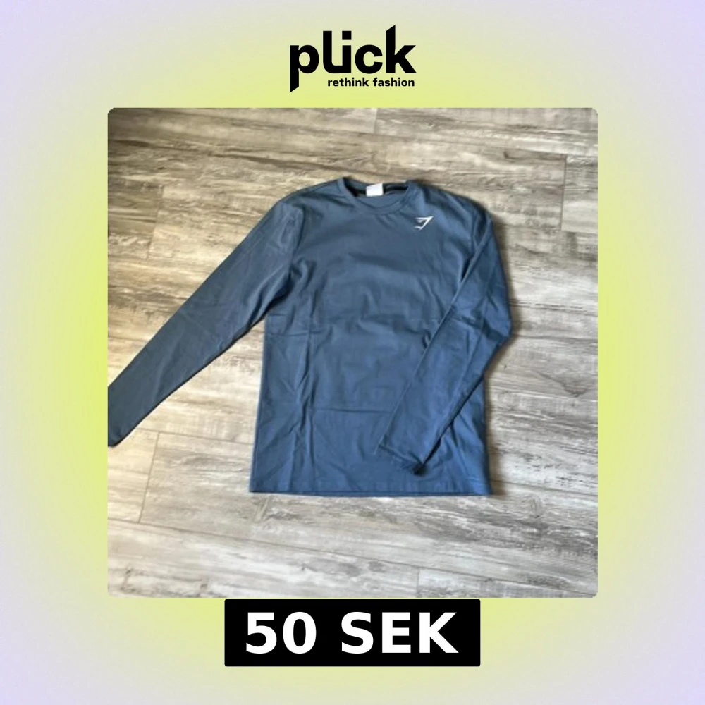 Säljer en stilren blå långärmad tröja från Gymshark. Perfekt för träning eller en avslappnad dag. Tröjan har en diskret logga på bröstet och är tillverkad i ett mjukt material. Är i Smal men Sitter som en medium