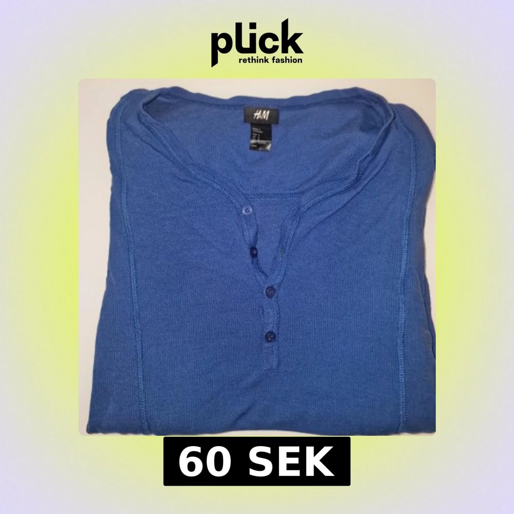 Blå långärmad farfarströja från H&M. Tröjan har en knappdetalj framtill och är tillverkad i ett mjukt material. Perfekt för en avslappnad stil. Garderobsrensning så kika gärna på övriga auktioner.