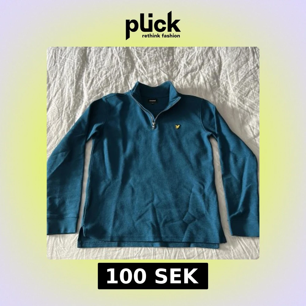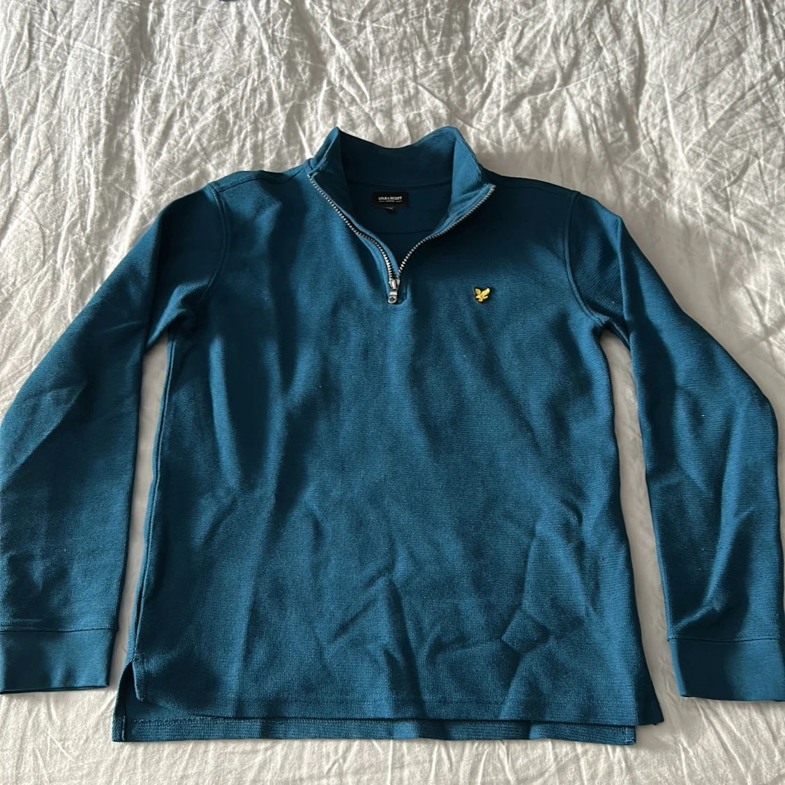 Säljer en blå långärmad tröja från Lyle & Scott Junior med halv dragkedja och klassisk krage. Den passar bra som S. Tröjan har en gul broderad logga på bröstet och är perfekt för en stilren vardagslook.