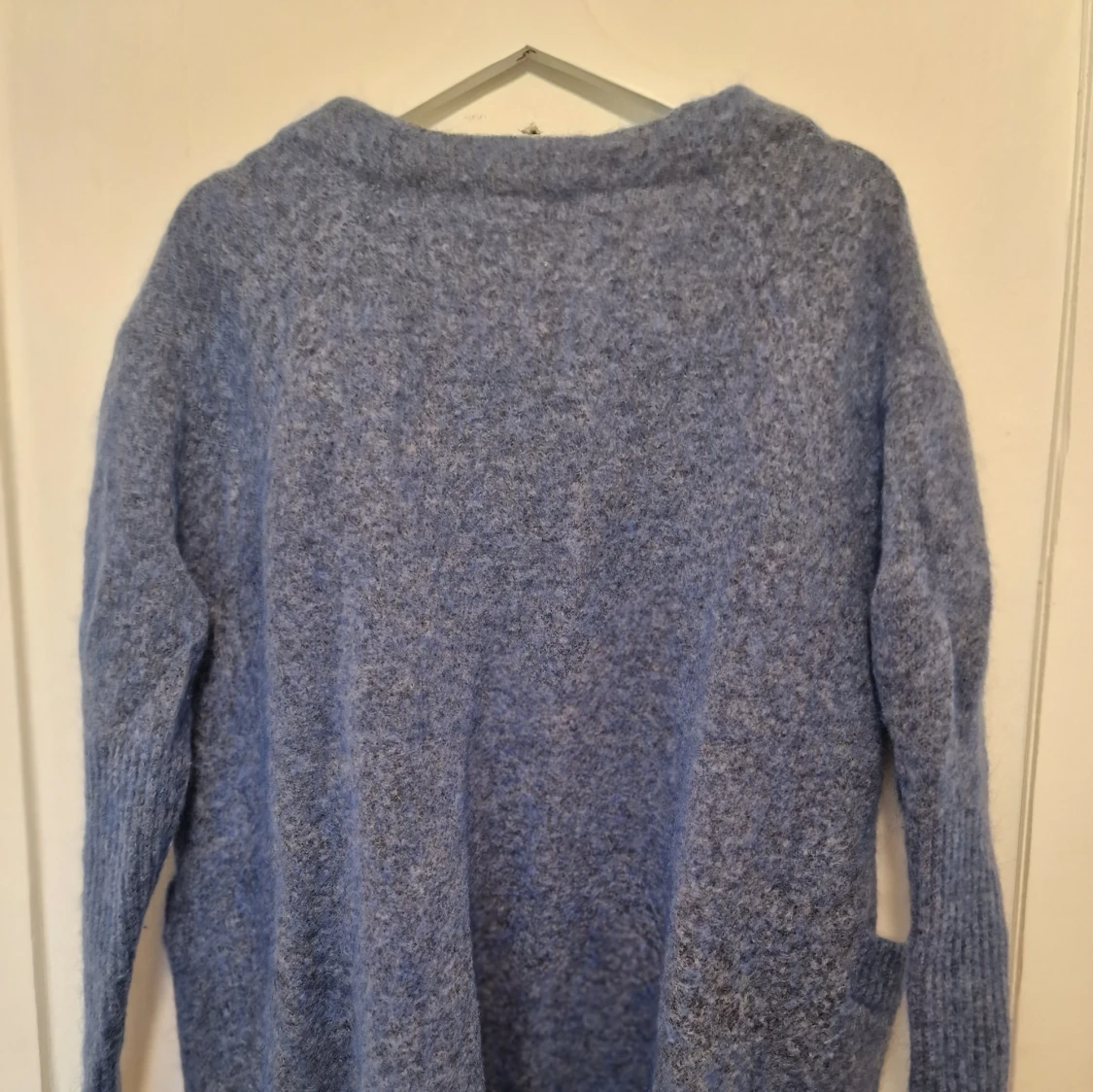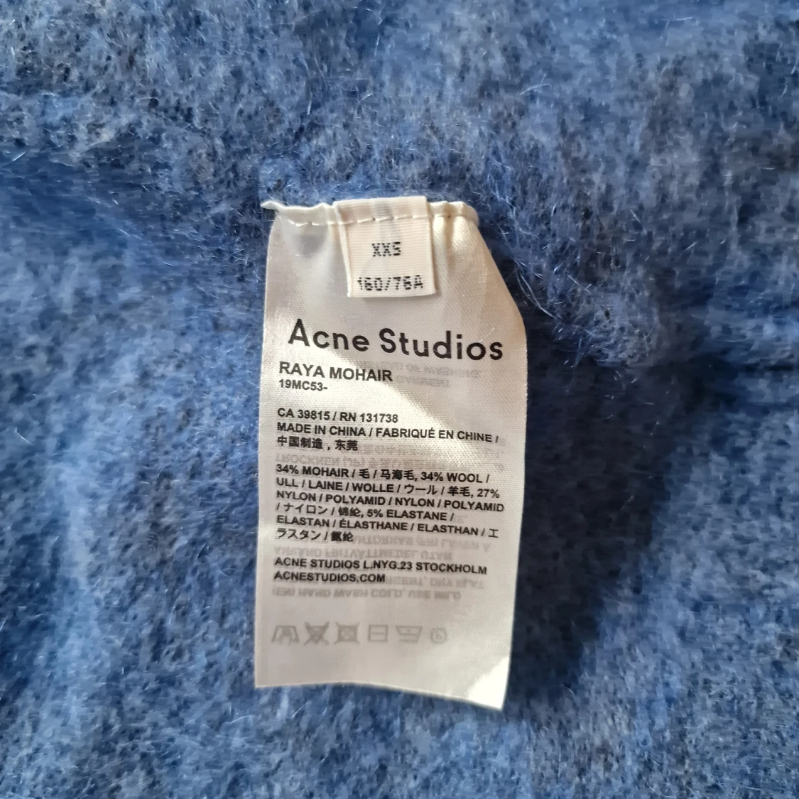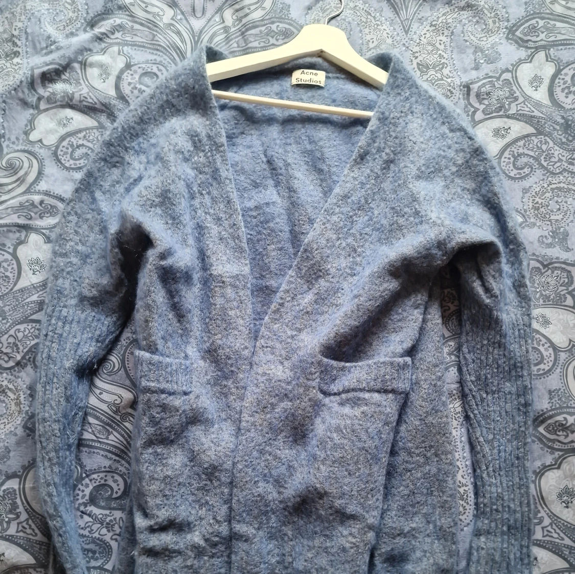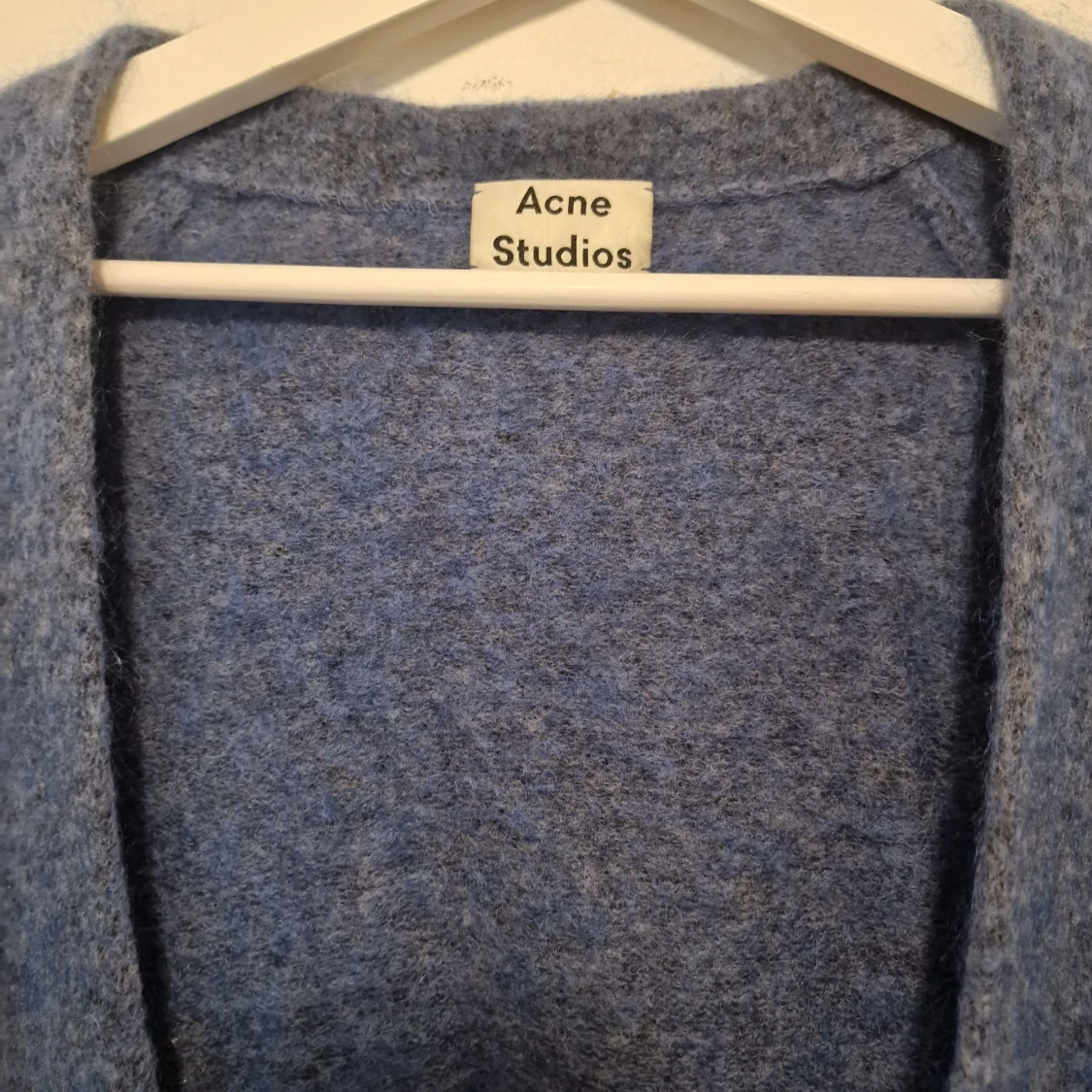 Mysig blå kofta från Acne Studios i raya mohair. Supermjuk och sticker inte alls. Perfekt för lager-på-lager och chill vibes under kyliga dagar. Utsåld och nypris strax över 5000 kr. Använd under 5 gånger så nästan ny. Deras XXS är likvärdig S-M och till och med liten L.