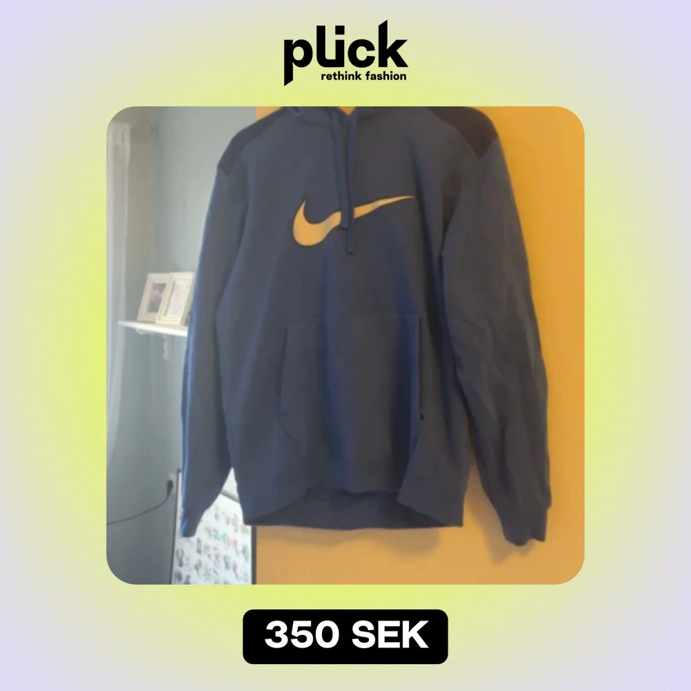 Säljer en snygg blå hoodie från Nike med det klassiska swoosh-loggan i vit på bröstet. Den har långa ärmar och en stor ficka framtill. Perfekt för höst och vinter när du vill hålla dig varm och bekväm. Passar både till träning och vardags.