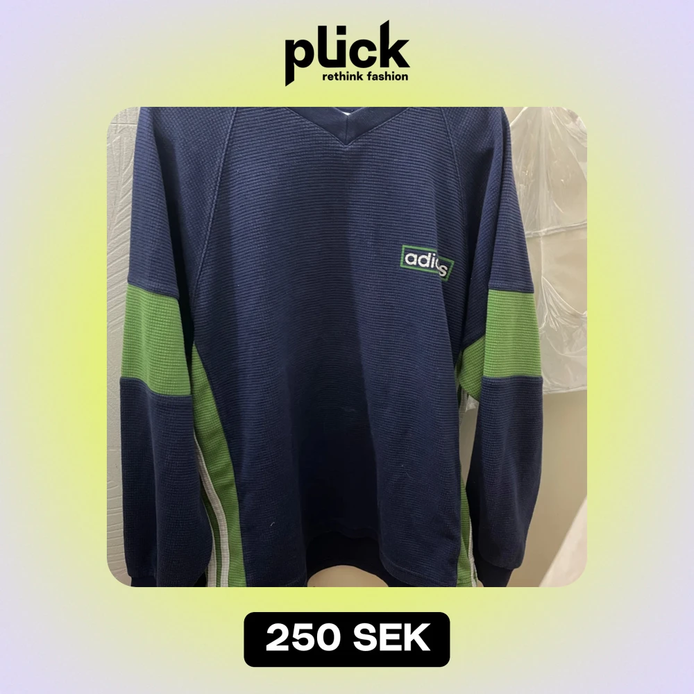 Säljer en snygg blå tröja från Adidas med gröna detaljer. Tröjan har en v-ringad hals och långa ärmar. Perfekt för en sportig look eller en avslappnad dag. Den är i bra skick och redo för nya äventyr!