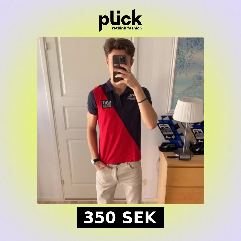 Säljer en snygg pikétröja från GANT i blått och rött med broderade detaljer och en krage med knappar. Perfekt för en stilren look. 183 cm på bilden!