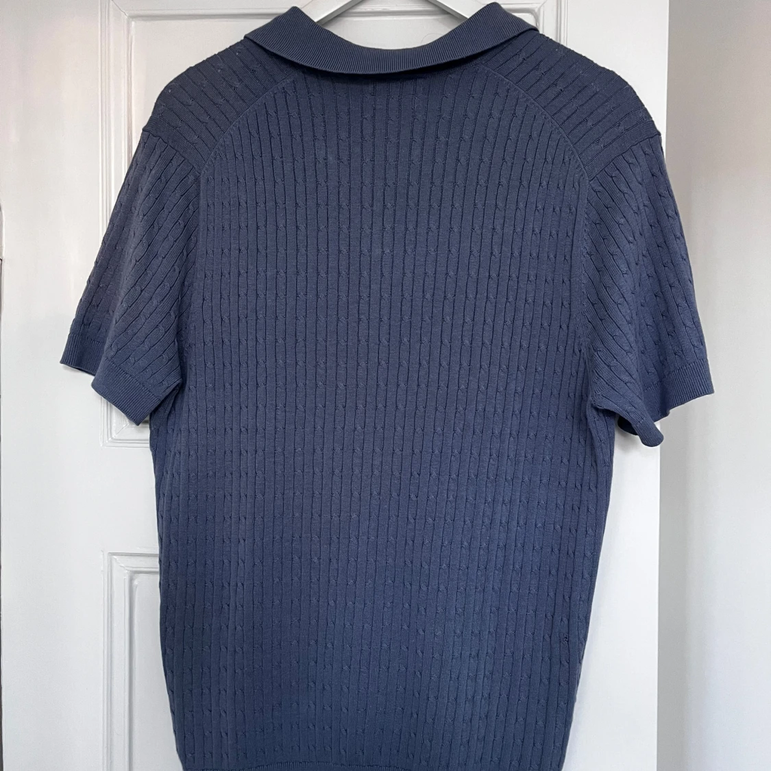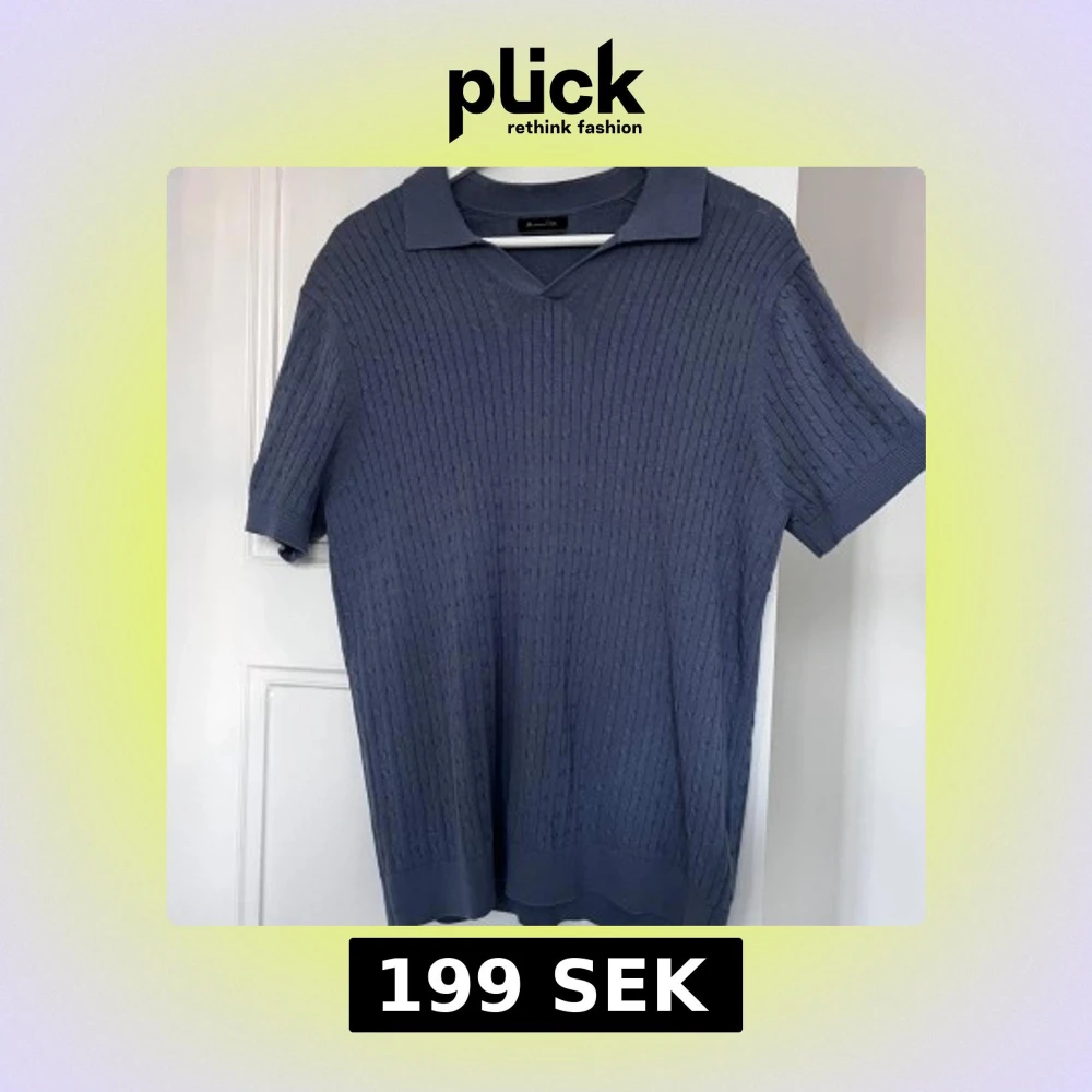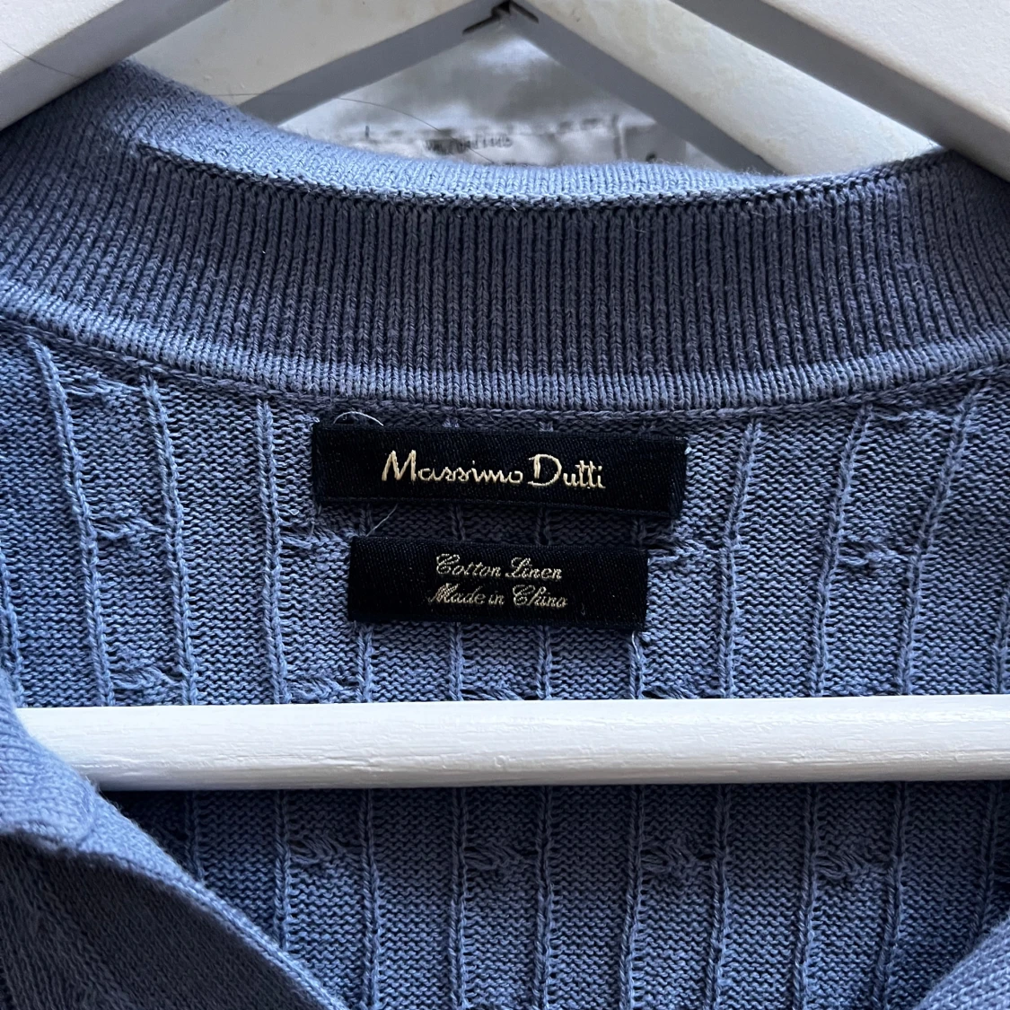 Snygg blå pikétröja från Massimo Dutti i bomull och linne. Tröjan har korta ärmar och ett diskret ribbat mönster. Perfekt för en stilren look. Hör av dig vid minsta fråga eller fundering!