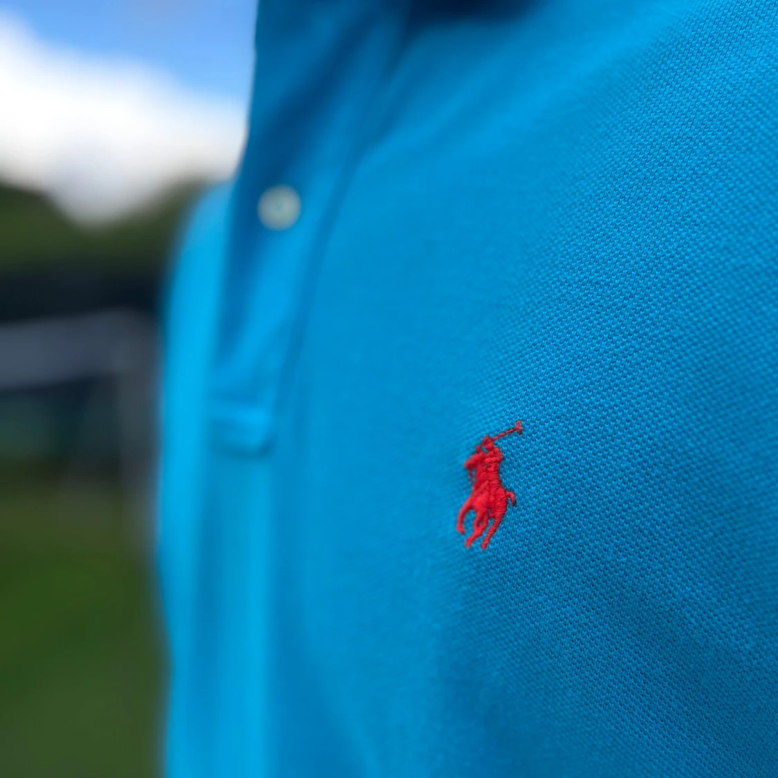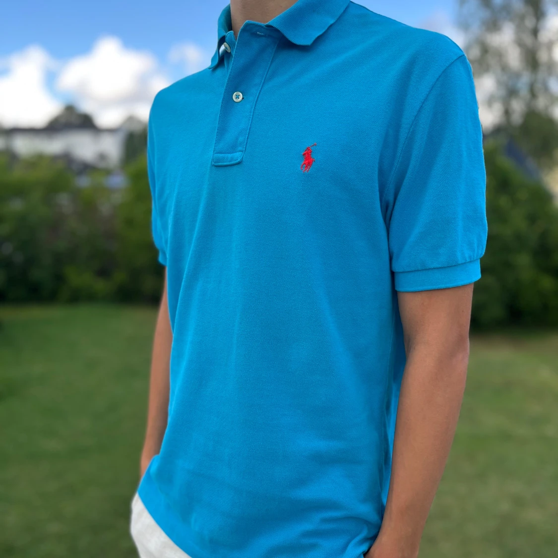 Snygg blå pikétröja från Polo Ralph Lauren med klassisk passform. Tröjan har korta ärmar, krage och knäppning framtill samt den ikoniska röda broderade loggan på bröstet. Perfekt för en fräsch och stilren look.