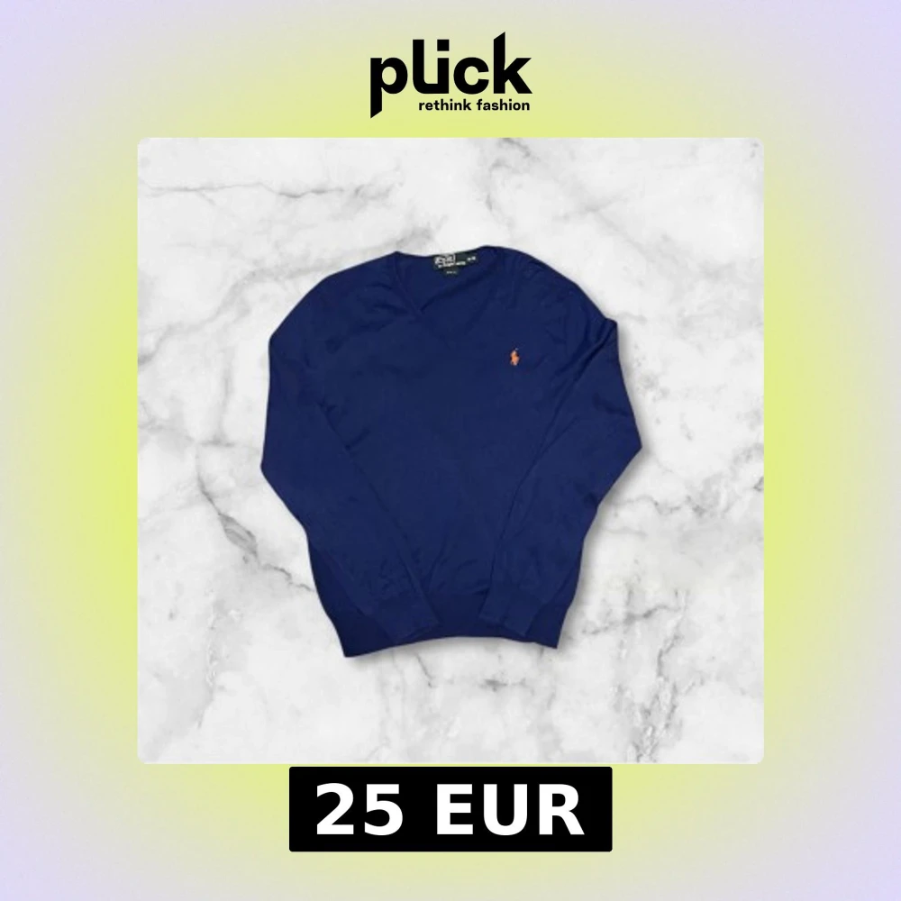 Säljer en stilren blå tröja från Polo Ralph Lauren med v-ringning och det klassiska logotypbroderiet i orange på bröstet. Tröjan har en slim passform och är perfekt för en elegant look. 10/10 skick