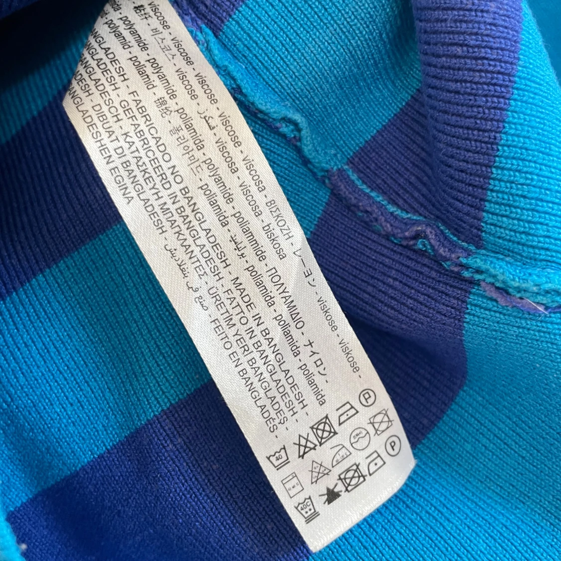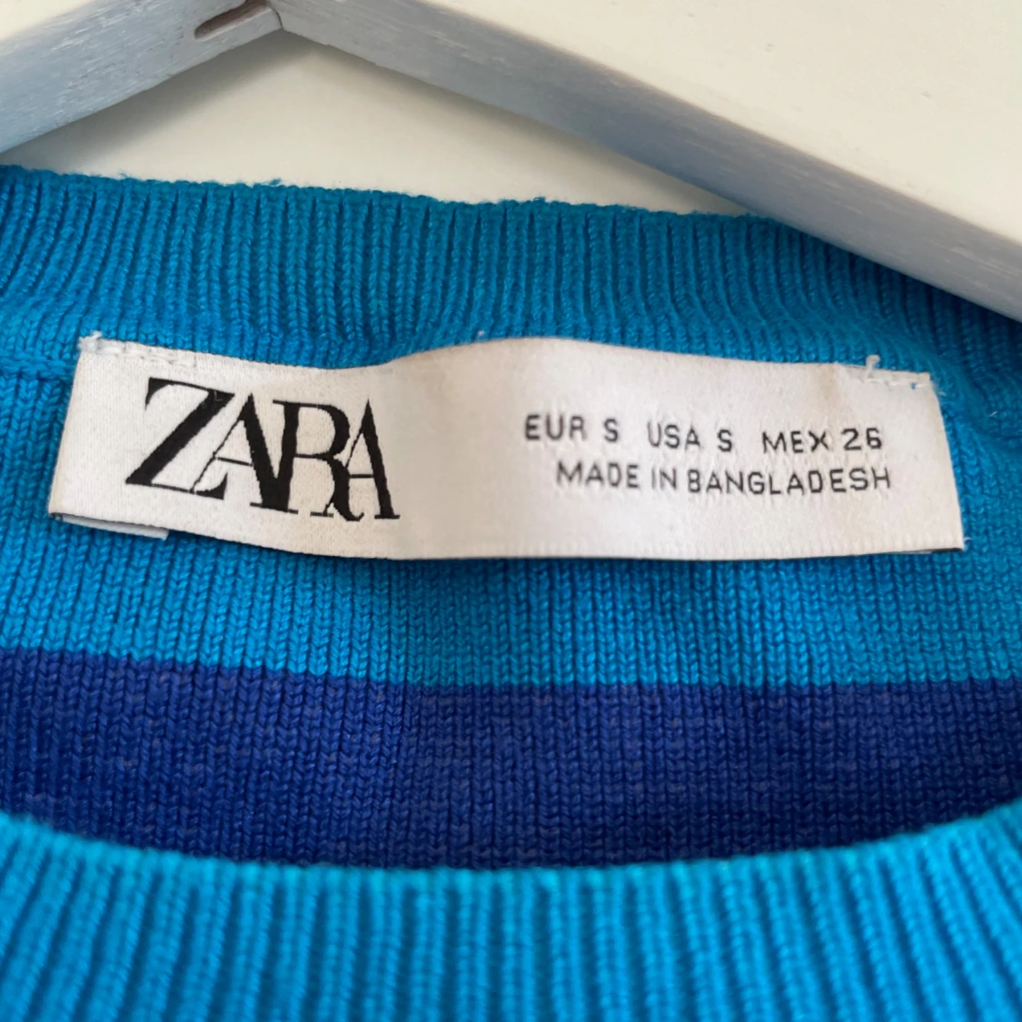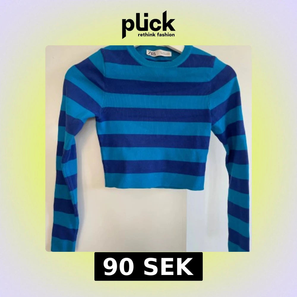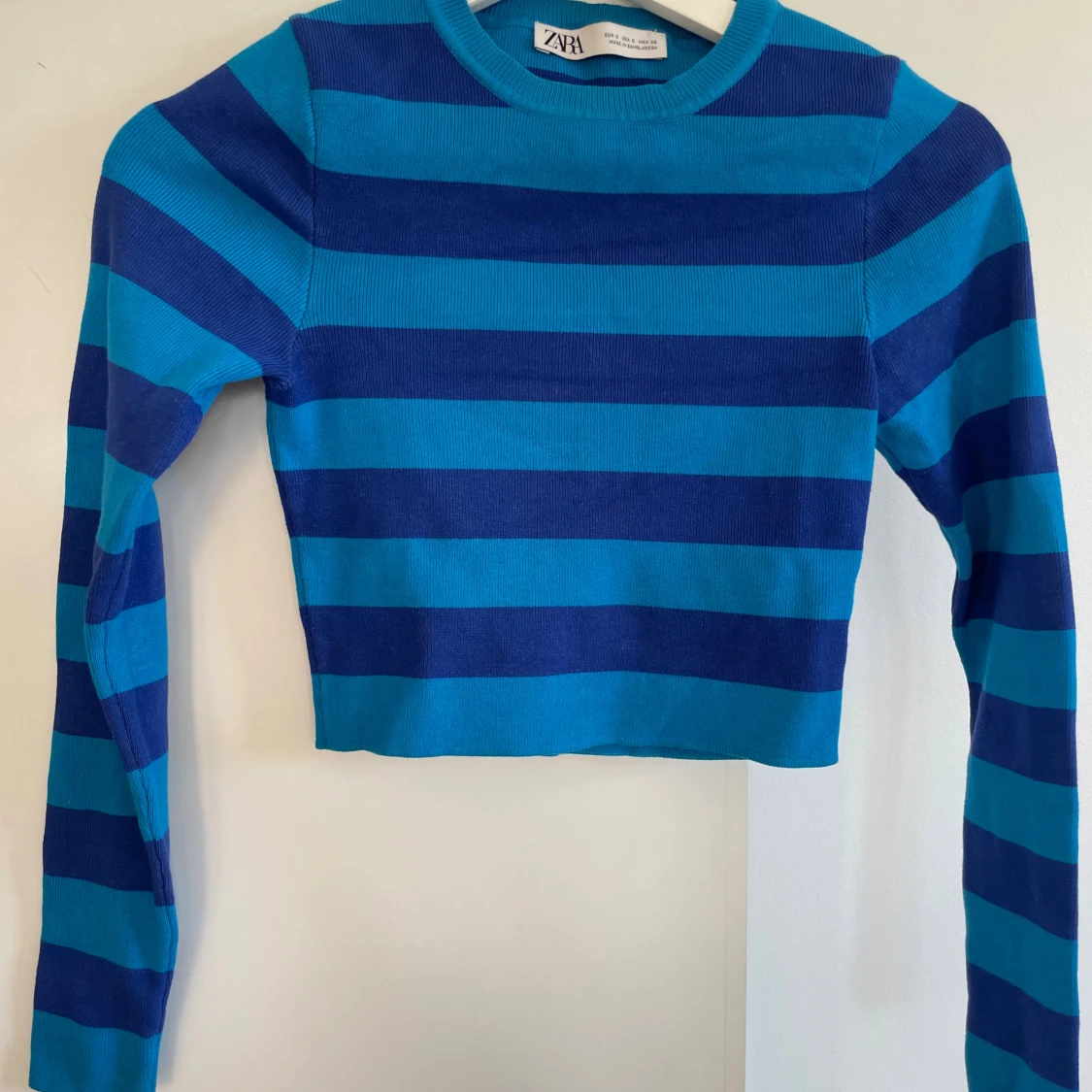 Säljer en croppad långärmad tröja från Zara i blåa och marinblåa ränder. Tröjan har en tight passform och är tillverkad i en mjuk viskosblandning. Perfekt för dig som gillar färg och vill sticka ut lite extra.