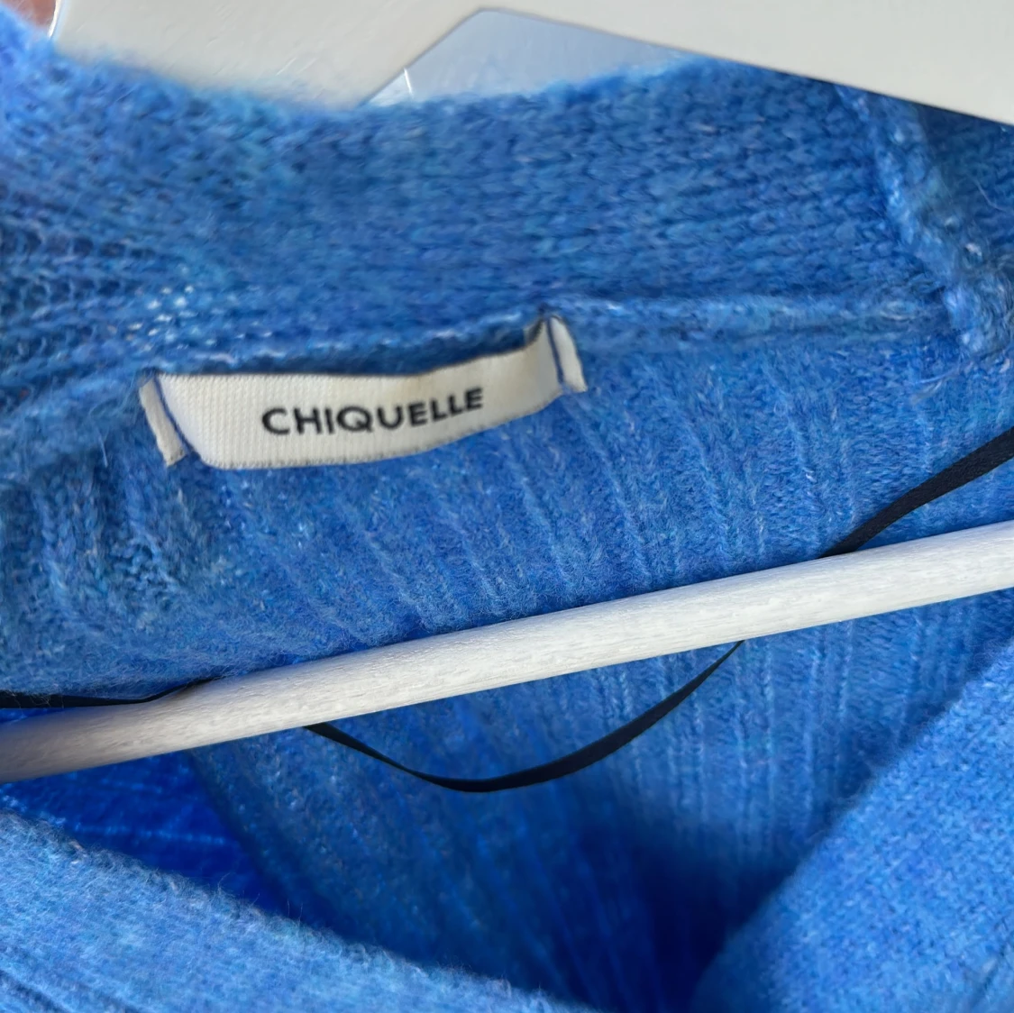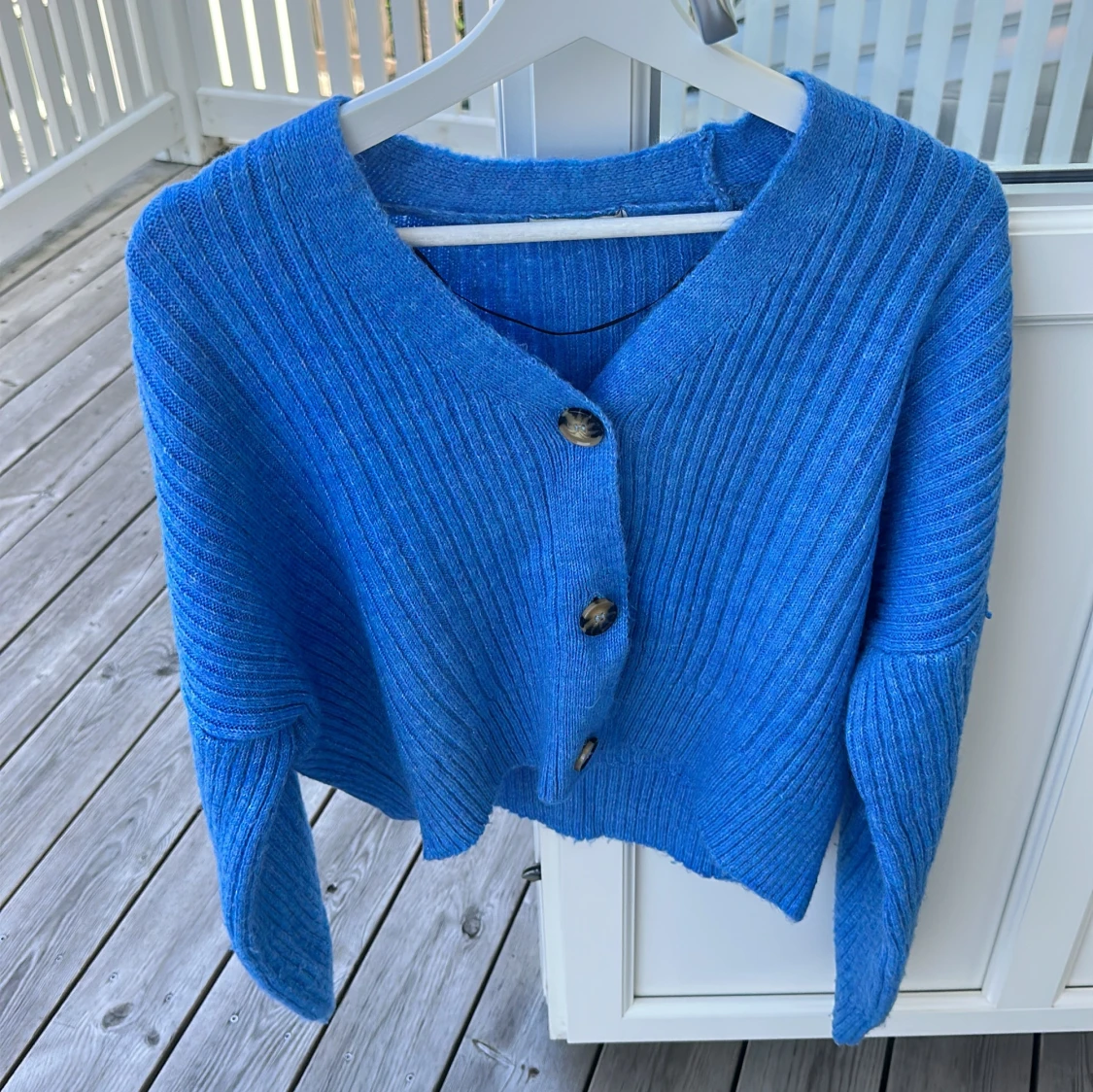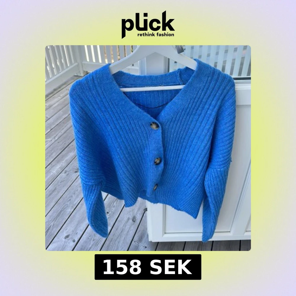 Snygg blå ribbstickad kofta från Chiquelle med tre stora knappar framtill. Koftan har en loose passform och långa ärmar, perfekt att slänga på sig över en t-shirt. Materialet är stickat och känns mjukt mot huden.