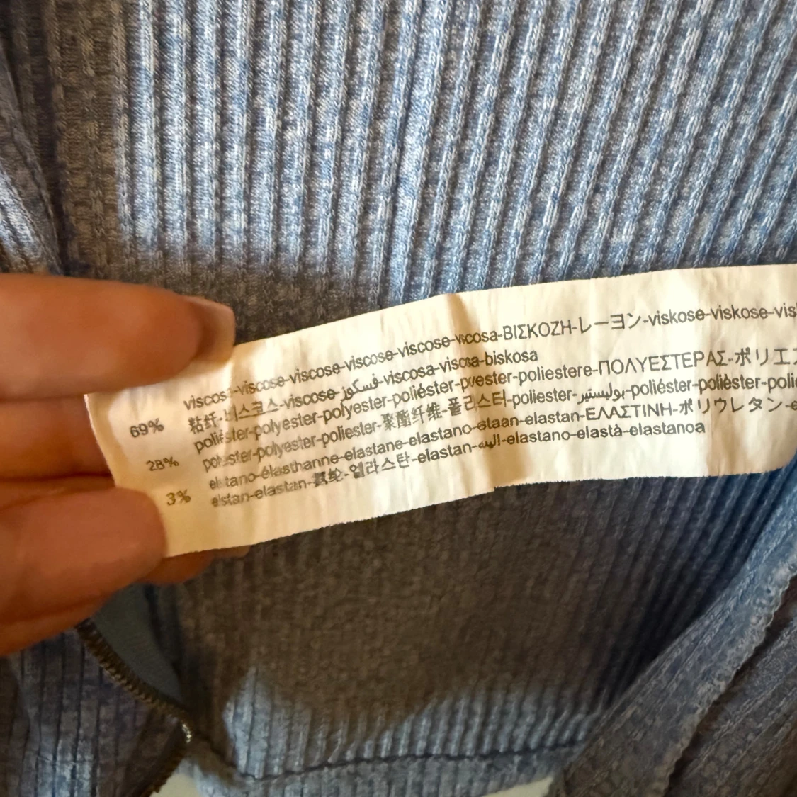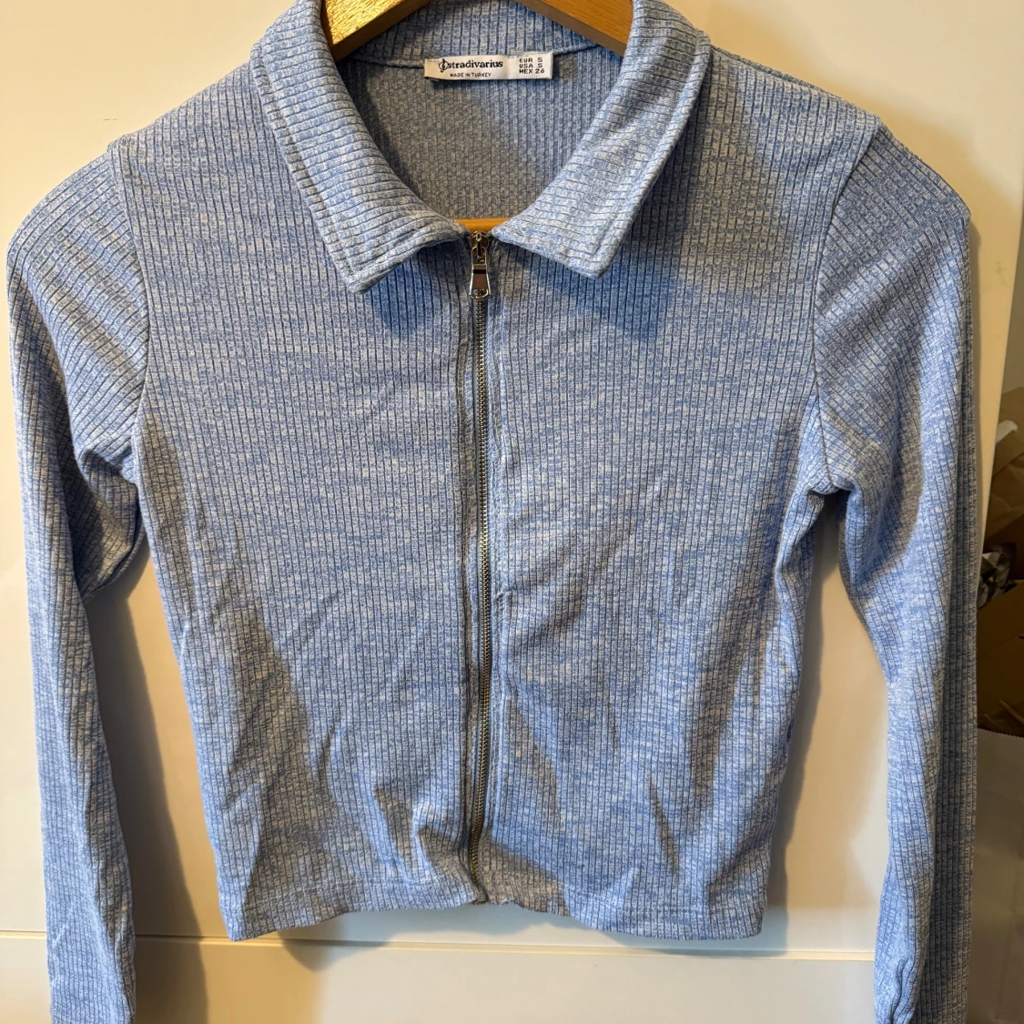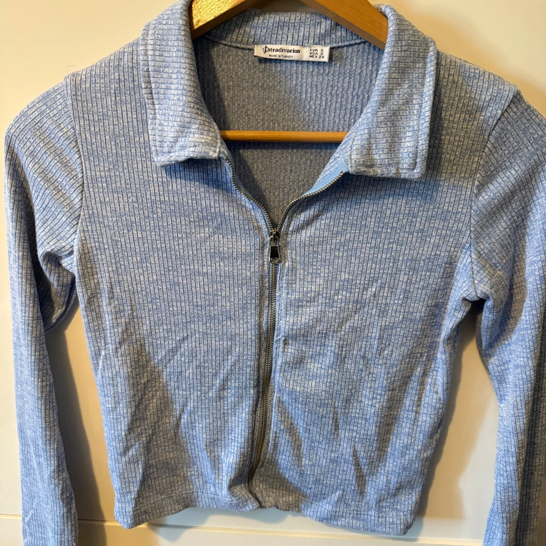 Säljer en ljusblå ribbad kofta från Stradivarius med dragkedja framtill och klassisk krage. Tröjan är långärmad och har en tight passform. Materialet är en mix av viskos och polyester med lite stretch för extra komfort. Storlek S. Inte alls mycket använd