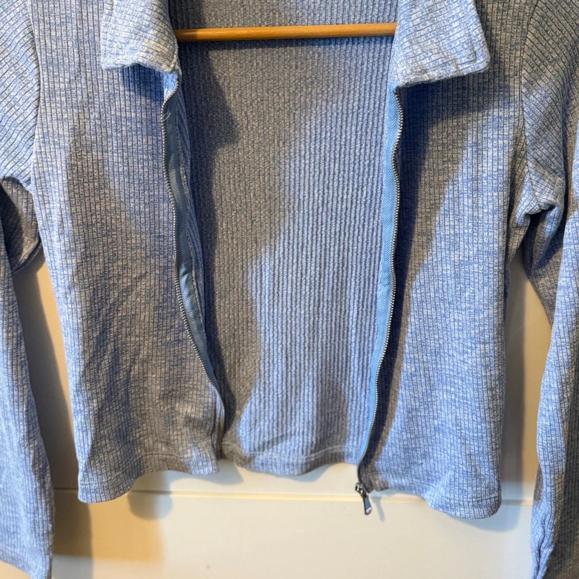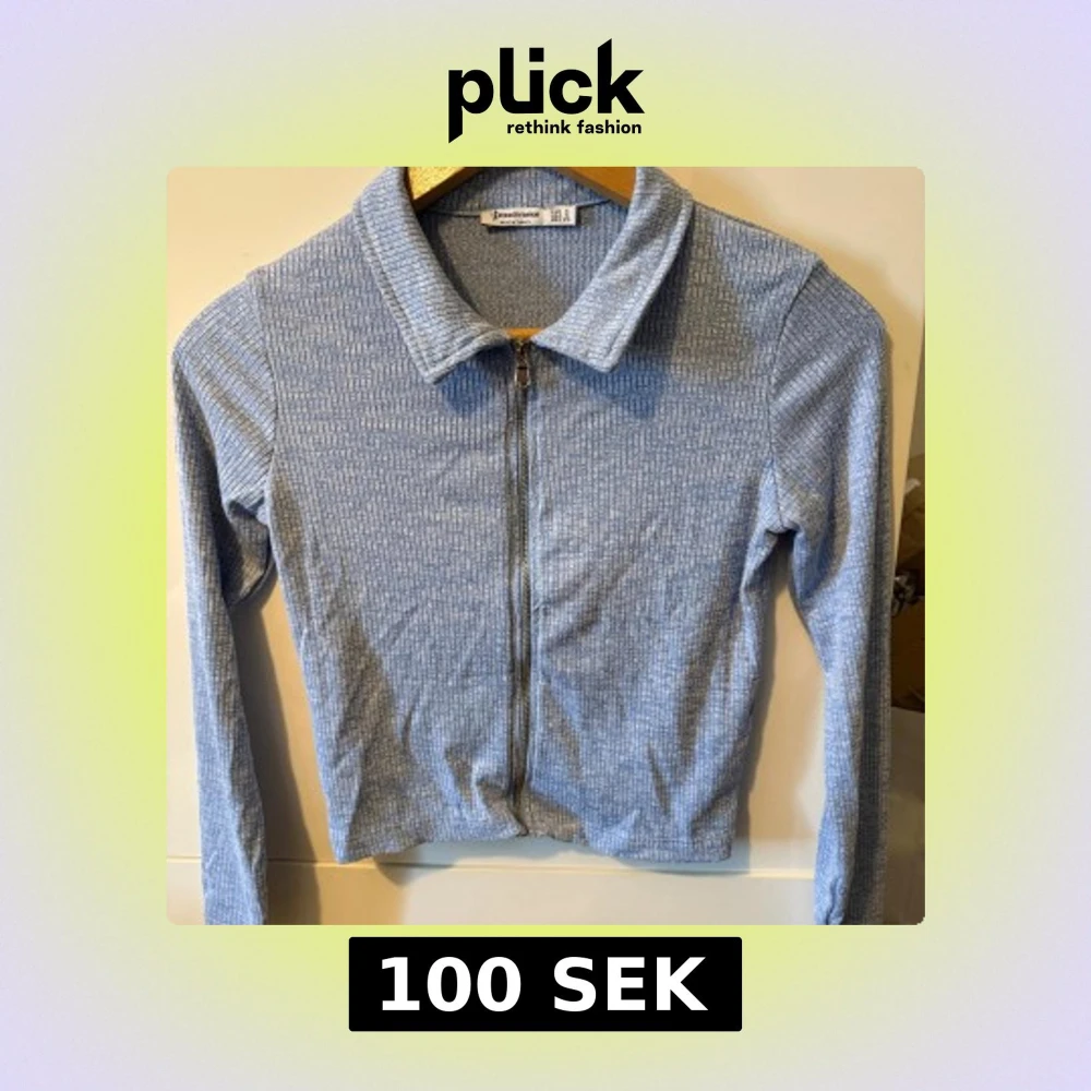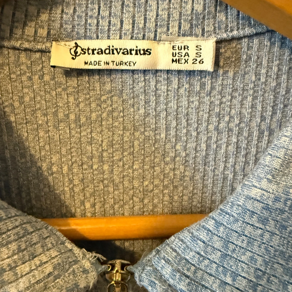Säljer en ljusblå ribbad kofta från Stradivarius med dragkedja framtill och klassisk krage. Tröjan är långärmad och har en tight passform. Materialet är en mix av viskos och polyester med lite stretch för extra komfort. Storlek S. Inte alls mycket använd