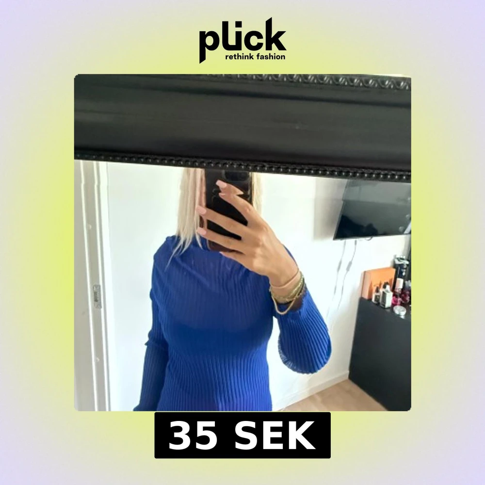 Säljer en blå långärmad meshtröja med ribbat mönster. Tröjan är genomskinlig och har en hög hals, vilket ger en trendig och edgy look. Materialet är lätt och stretchigt.