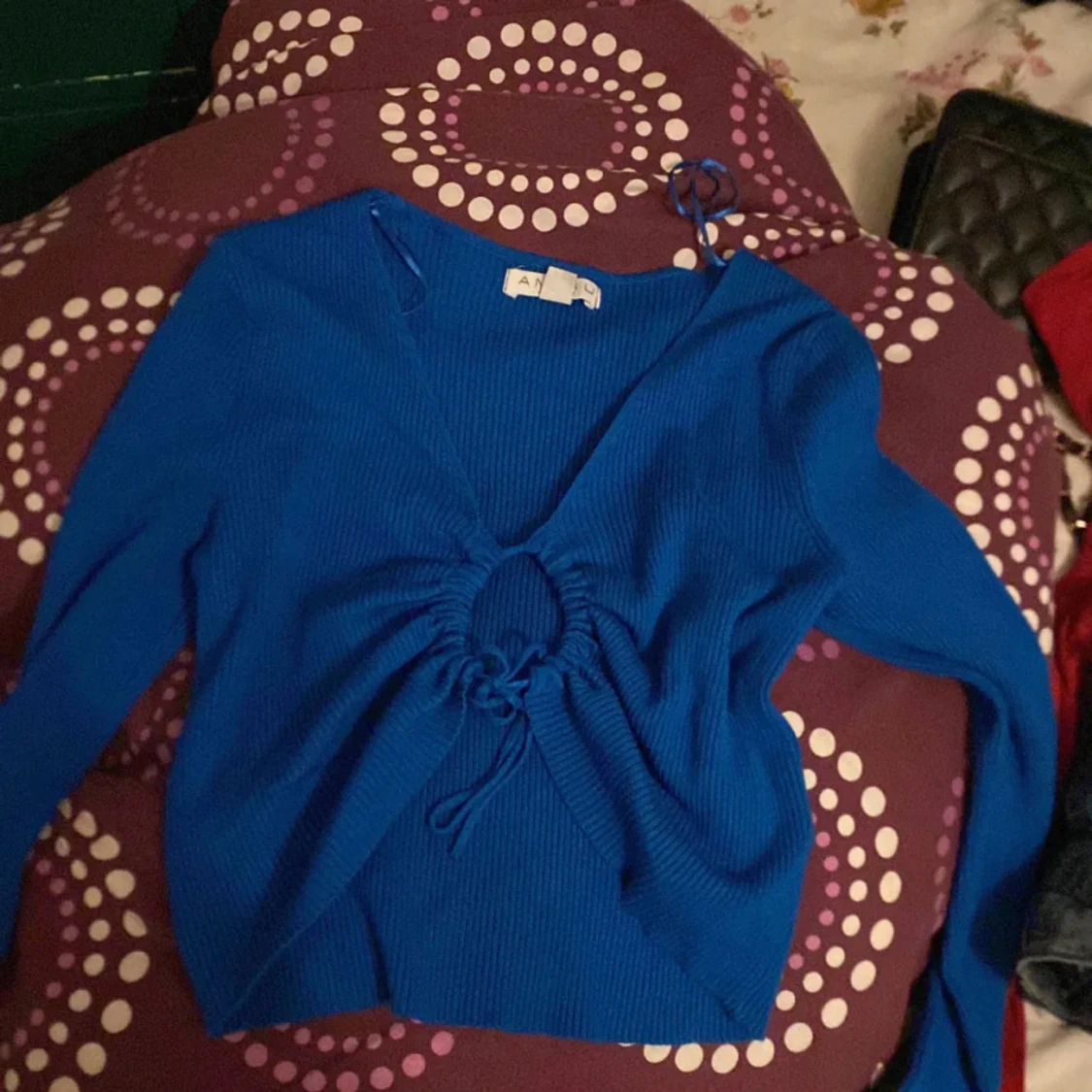Säljer en snygg blå ribbad tröja med v-ringning och knytning framtill. Tröjan har långa ärmar och en croppad design som ger en trendig look. Har använt en gång . Väldigt fin