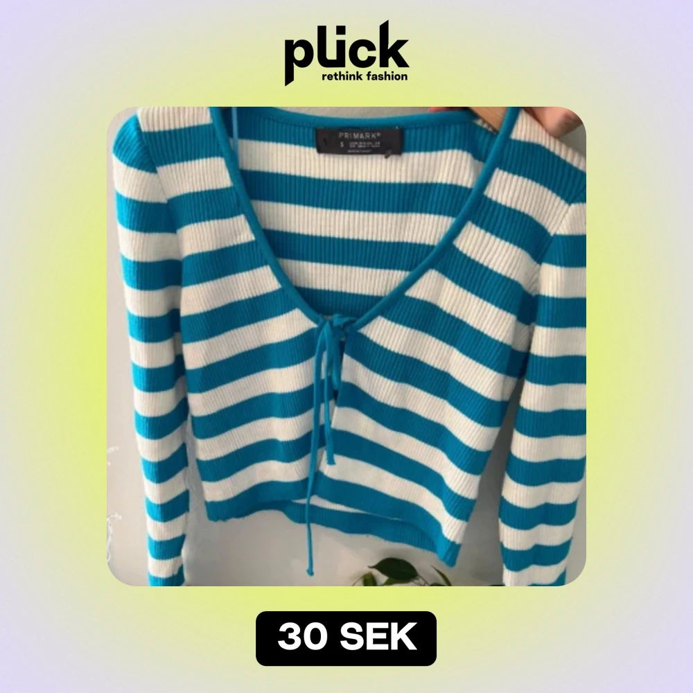 Säljer en superfin randig tröja från Primark i storlek S. Den är blå och vit med ett snyggt ribbat mönster och har en söt knytning framtill. Tröjan är croppad och har långa ärmar, perfekt för både vår och sommar! 🌟