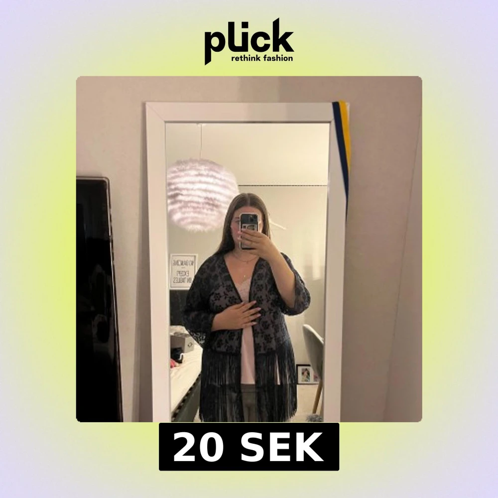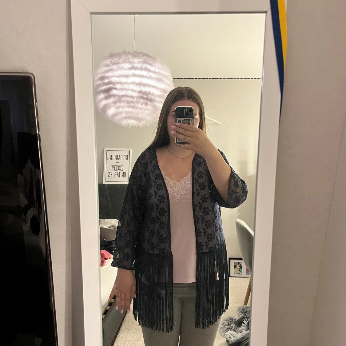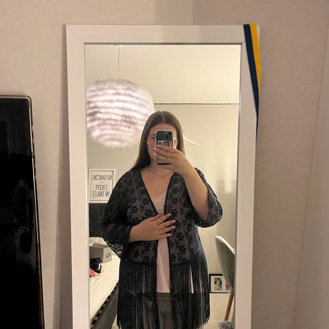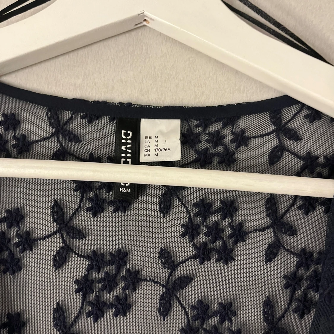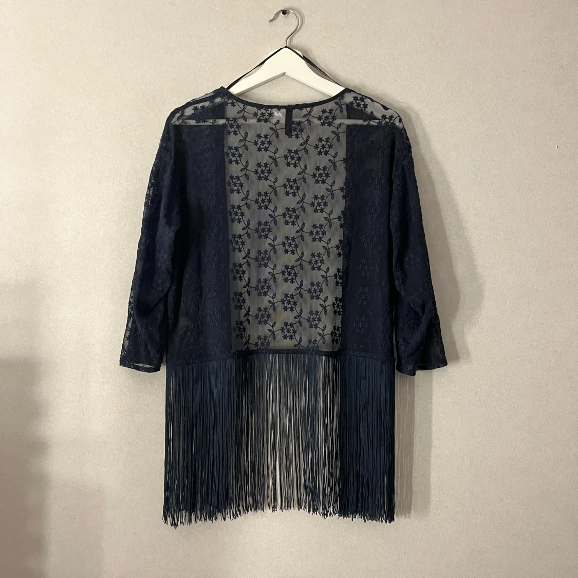 Säljer en marinblå volang kofta från H&M med blommigt spetsmönster och långa fransar nedtill. Koftan är transparent, har trekvartsärmar och öppen front. Perfekt för att ge outfiten en extra touch med coola detaljer.