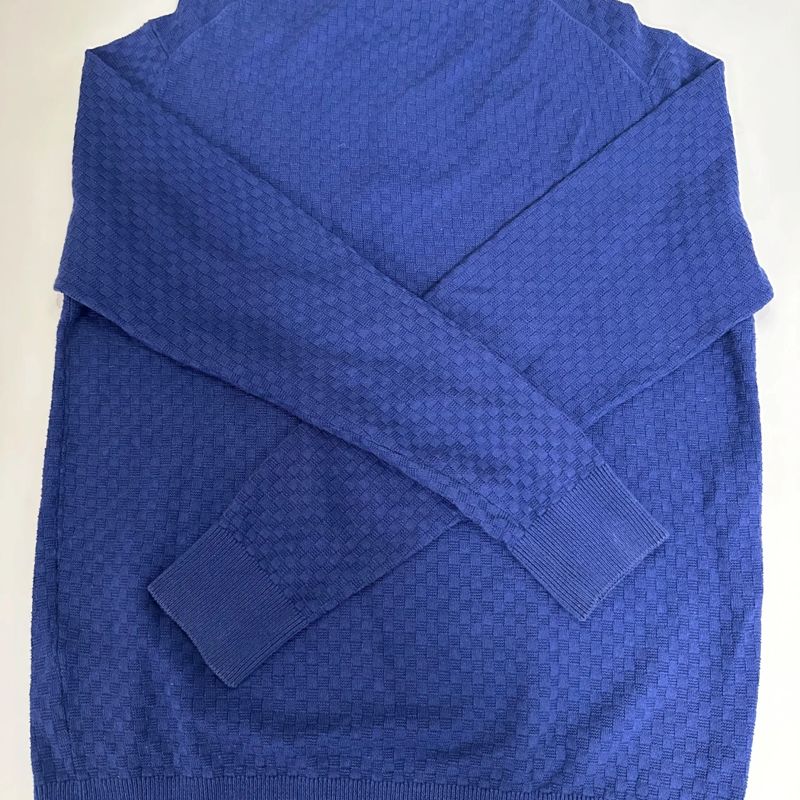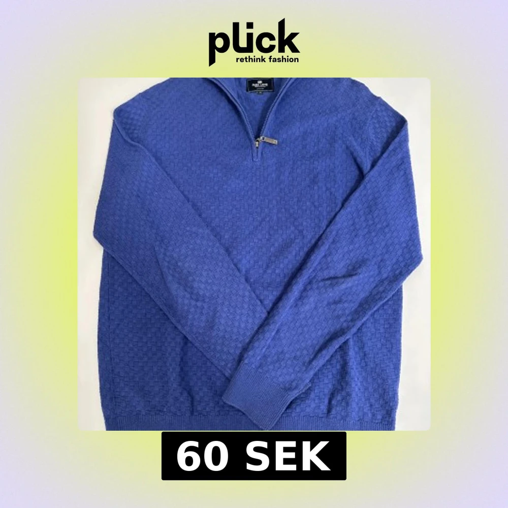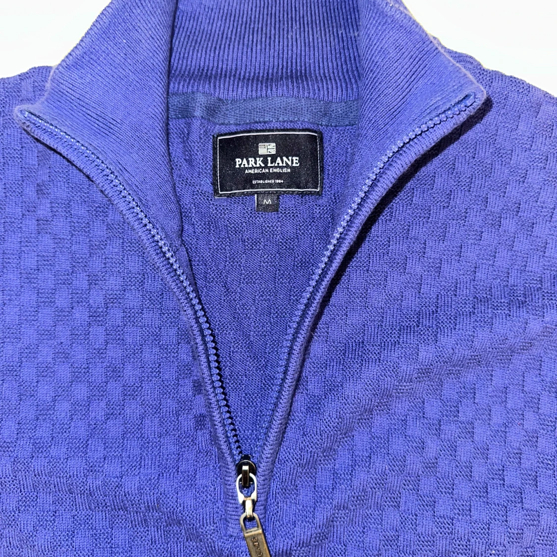 Snygg blå stickad tröja från Park Lane med diskret rutmönster och half zip-dragkedja vid kragen. Tröjan har lång ärm, ribbade muddar och en klassisk passform. Perfekt för dig som gillar stilren och bekväm look. Storlek M passar även large.