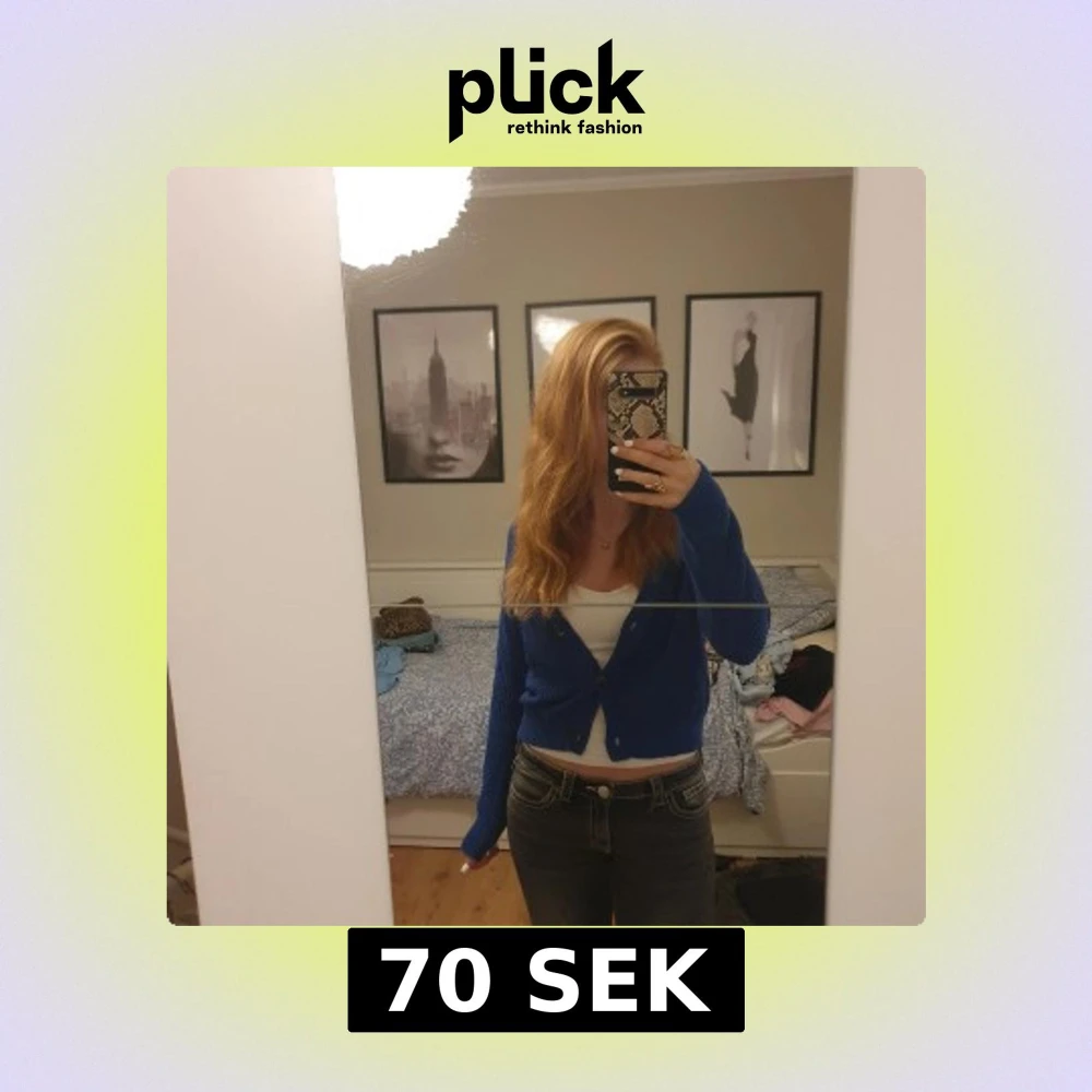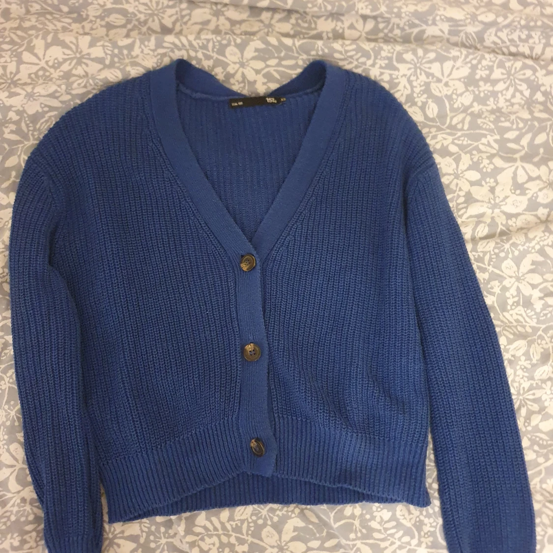 Säljer en blå stickad kofta från Lager 157 med v-ringning och tre bruna knappar framtill. Koftan är croppad och har långa ärmar samt ribbade muddar. Säljes då den inte kommer till användning!